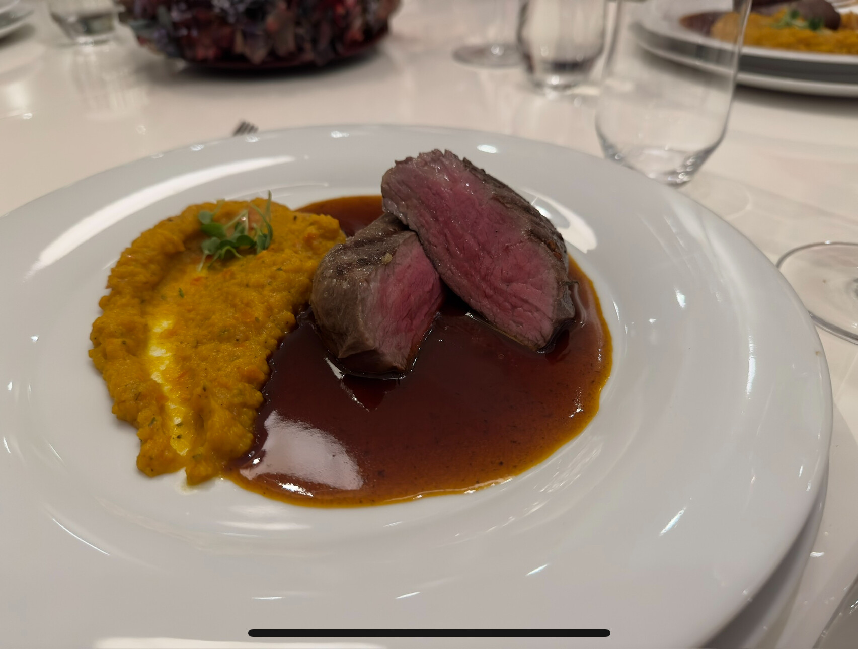 On Sunday there was a festive menu for four people. As a starter there was curry corn cream soup with Argentinian prawns and butter croutons. The second course was beef tartare from Campo Beef. The main course was fillet of Campo Beef prepared sous vide with pumpkin puree. Unfortunately I wasn’t hungry for dessert…