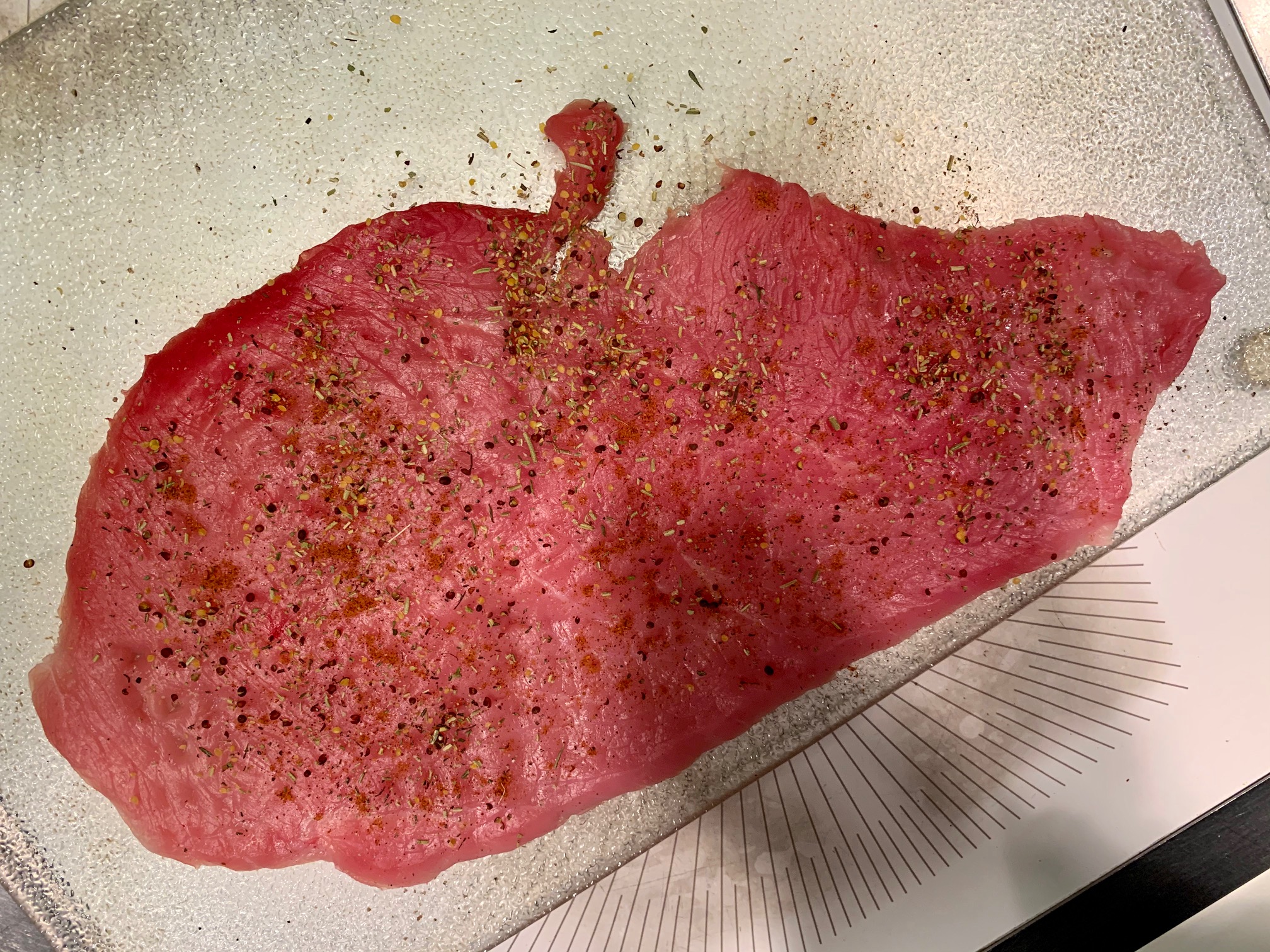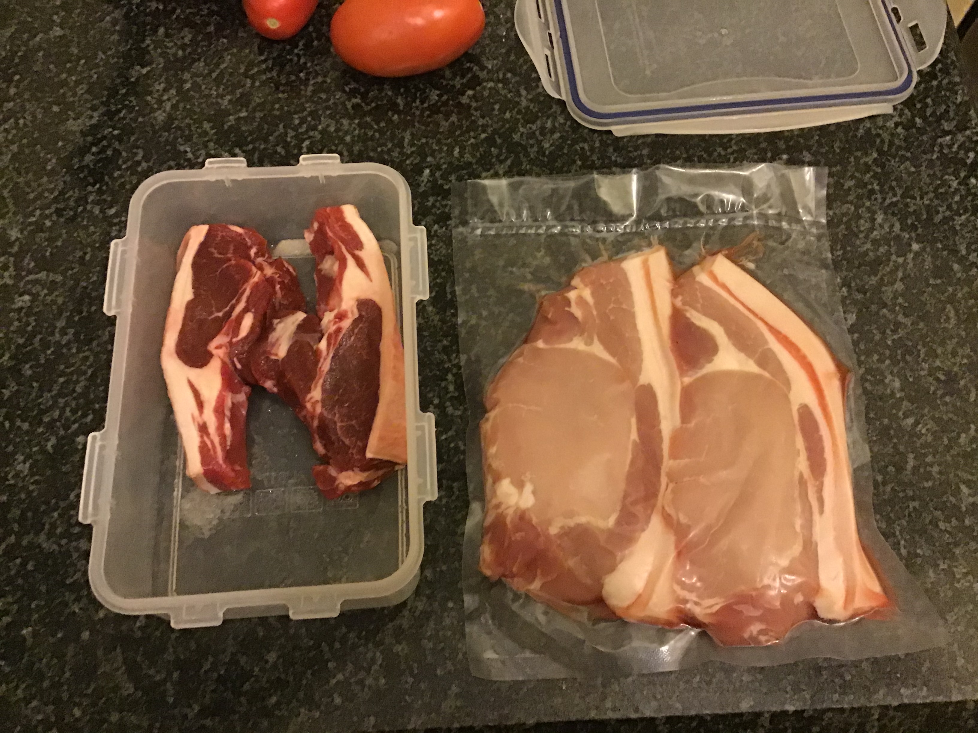 On the left are tonight’s lamb chops; they have had 24 hrs salting as recommended by Samin Nosrat in ‘Salt, fat, acid, heat’. On the right are the pork chops that are just about to be treated in the same way.