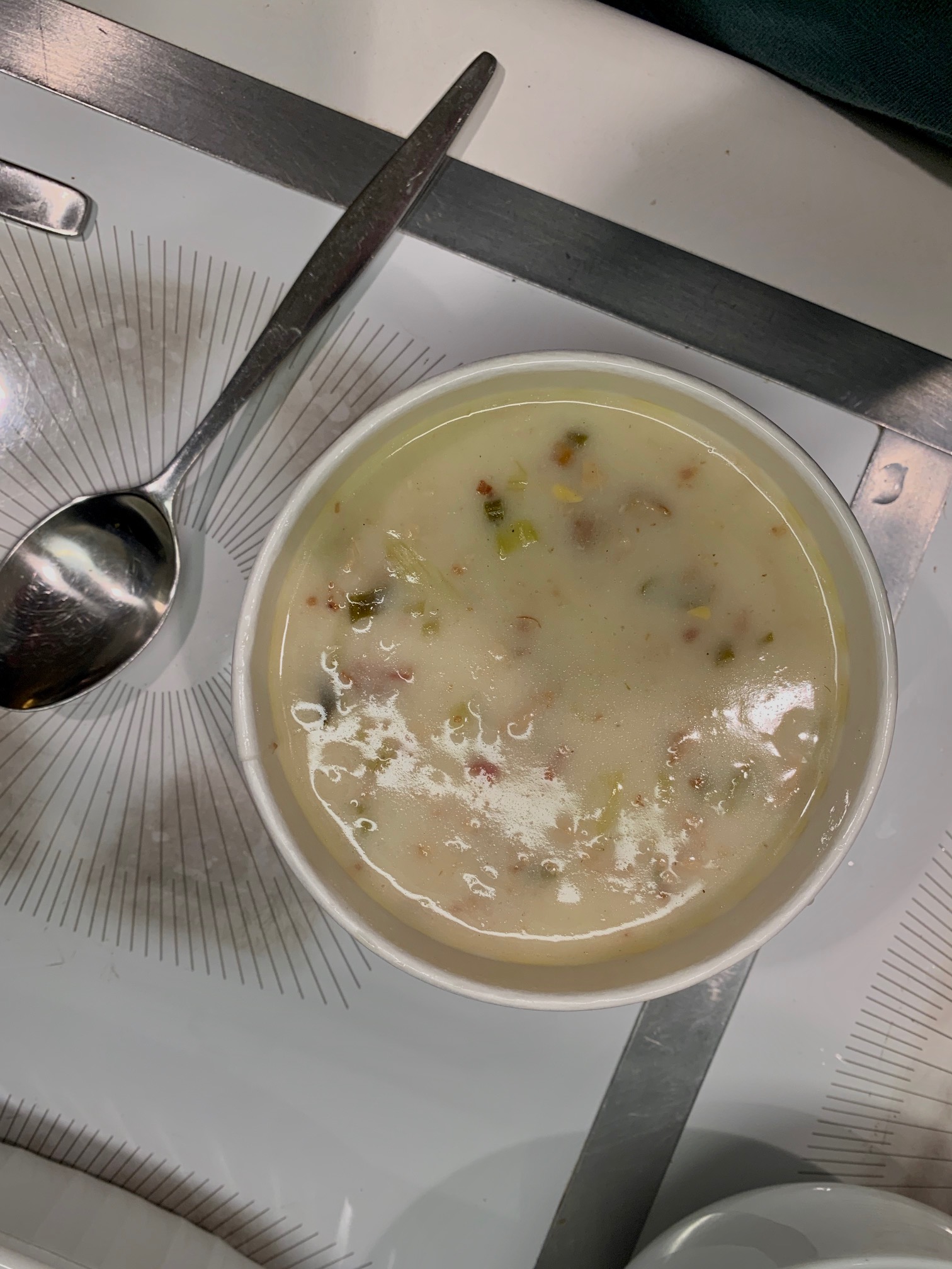 Cream based potato, ham and corn soup, much needed after five hours of slaving in the frozen yard and..
