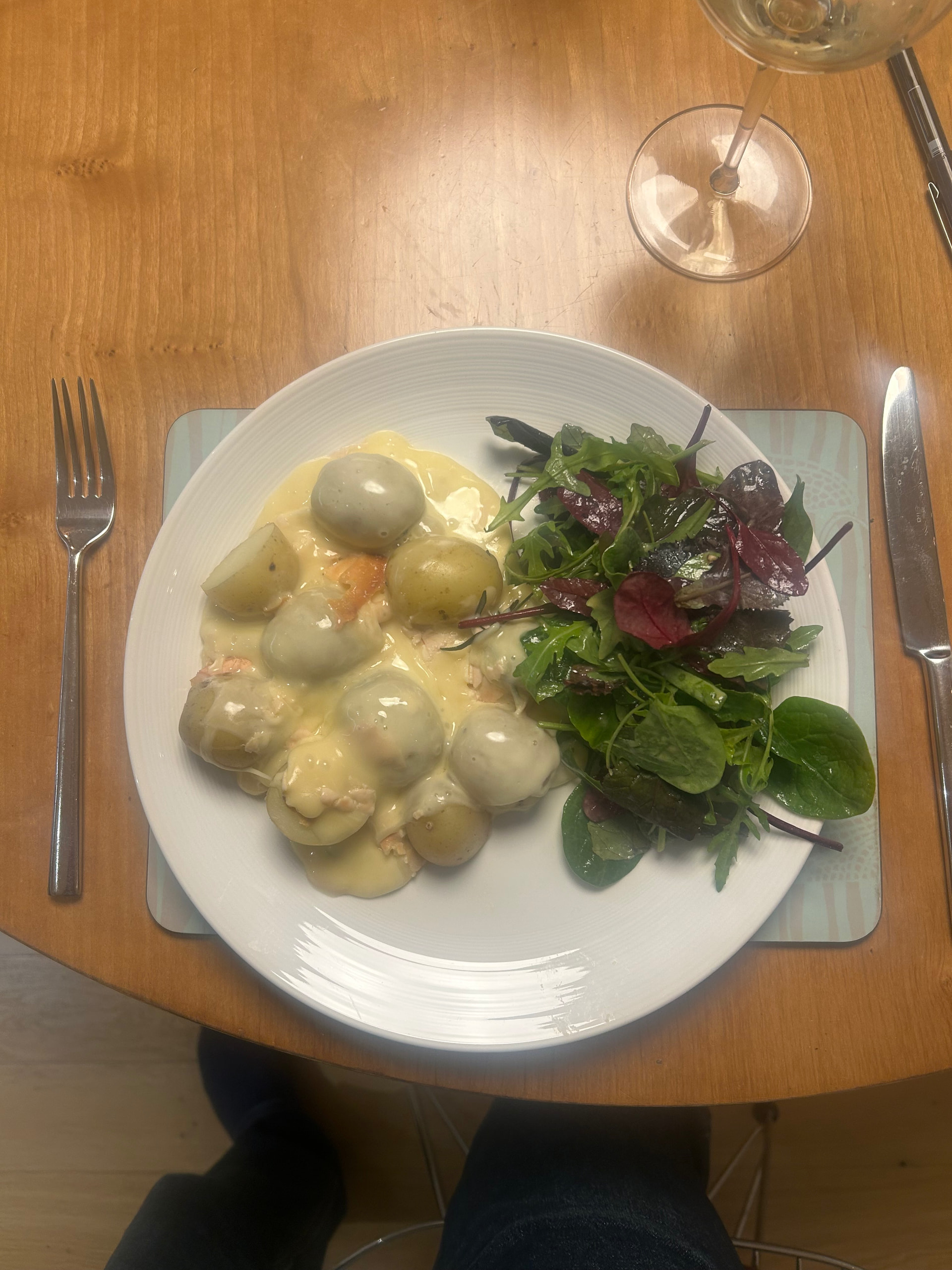 Served in the traditional way spooned on to new potatoes and a green salad dressed with a Dijon mustard dressing. My aunt is French and from this region so taught me how to do it proper. Served with a brilliant Godello from Bierzo.