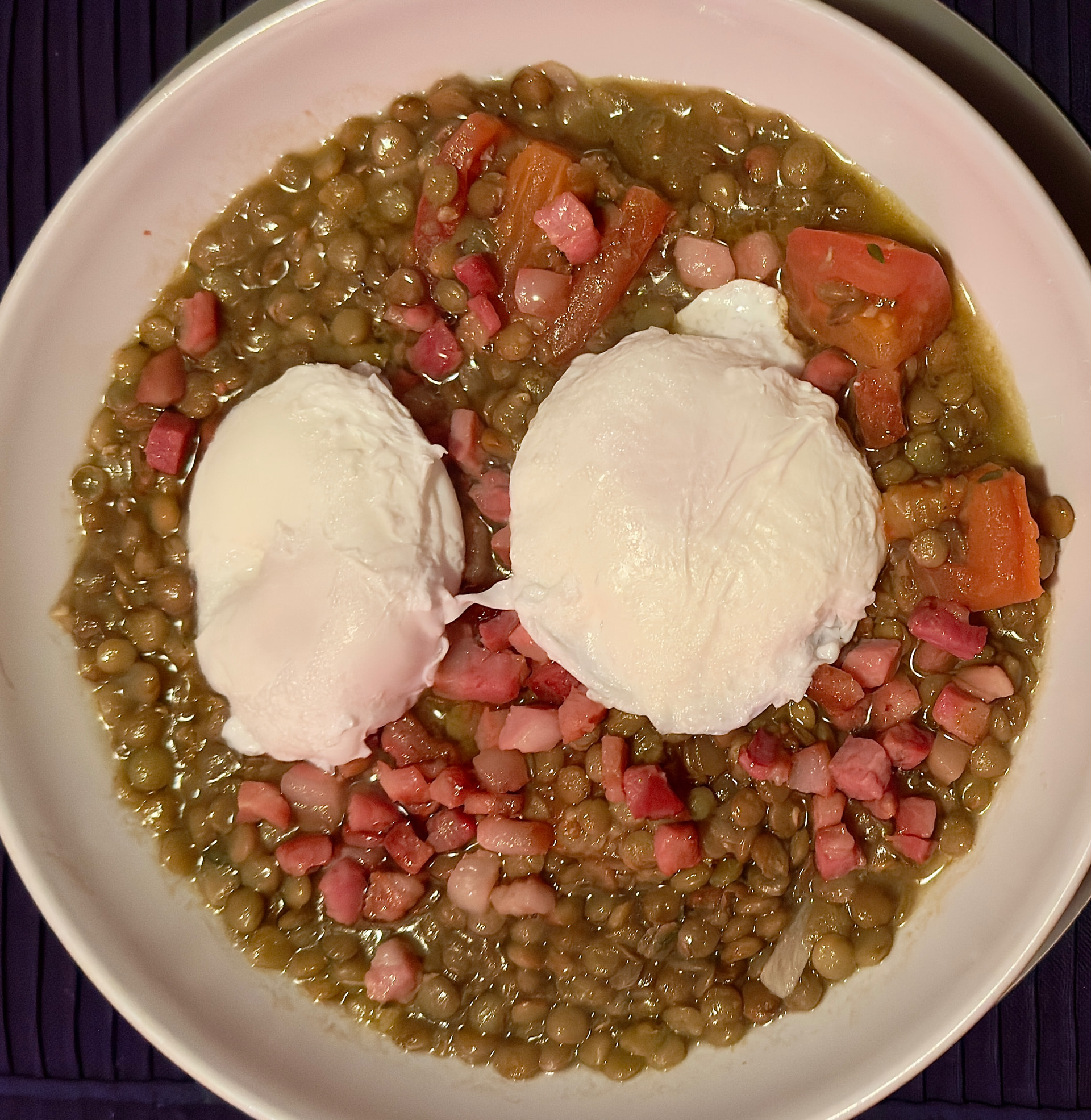 From the old Mezzo in london townâs fun filled Soho district.. Poached Eggs and Pancetta with Lentils and Tomatoes.
