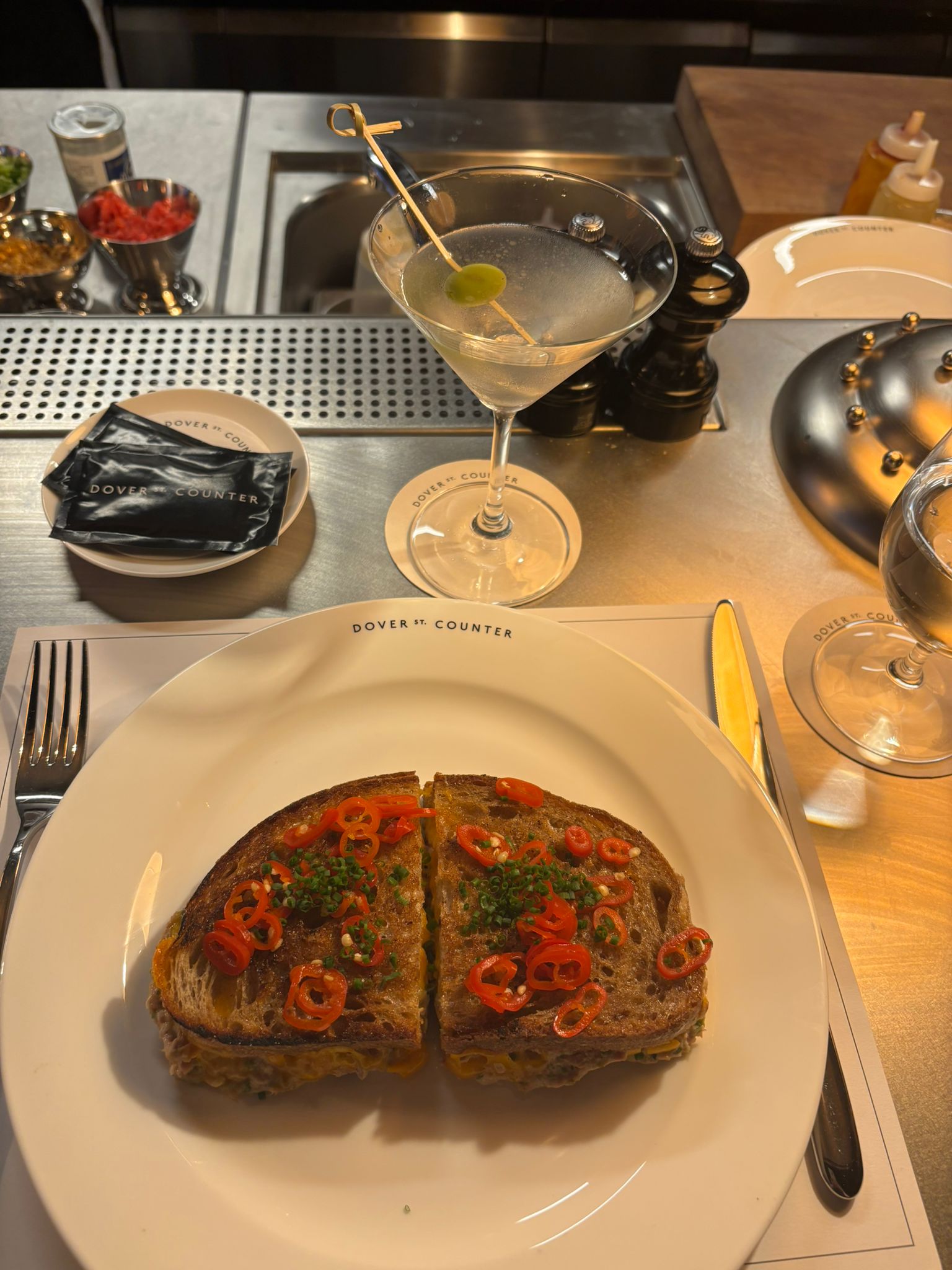 Not my cooking but yesterday my daughter and I decided to kick Xmas off by going to a new opening for lunch - the Dover St Counter near Green Park in London. They do fancy sandwiches and cocktails. I had a tuna melt with Red Leicester cheese and proper sourdough. They cooked it the proper way in a frying pan with a shed load of butter and then sprinkled pickled chillies on. I had it with two (two!) Gibsonâs. Great start to Xmas