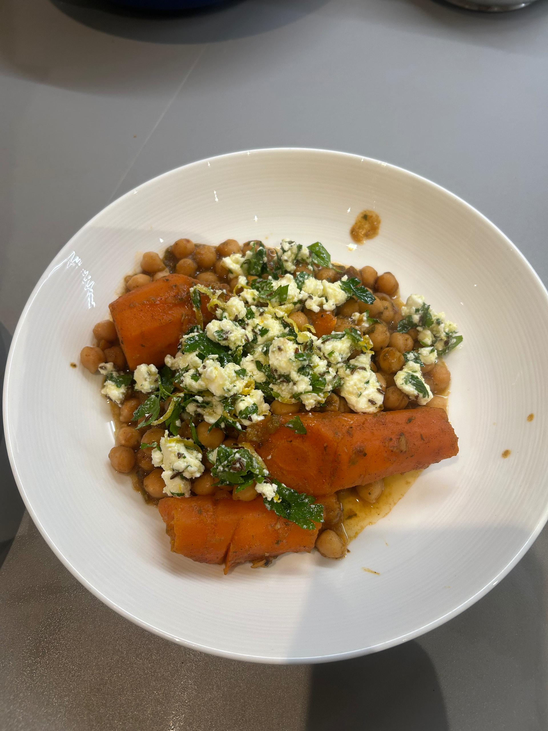 After an OD of meat at Xmas I try to up the veggie meals in Jan. This is an Ottolenghi recipe from the Guardian. Chick peas braised with carrots. Being Ottolenghi there are lots of ingredients. Chick peas also braised with dates, onion, garlic, cinnamon, cumin, green chilli, coriander, bay leaves, tomato puree, lemon juice. Final plates topped with feta marinated in EVOO, toasted caraway seeds, lemon zest and parsley. Absolutely delicious. Served with brown pitta breads