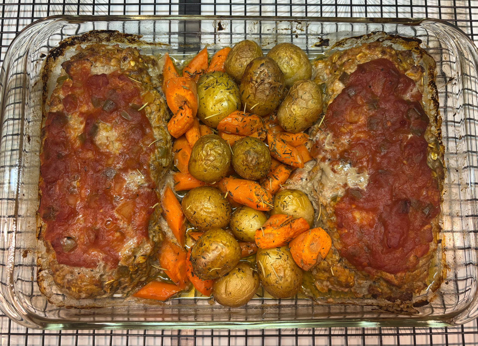 A PVB (pork, veal and beef) meatloaf. An extra flavor is provided by the freezing temperatures (15 F, feels like 1F with the wind) outside.