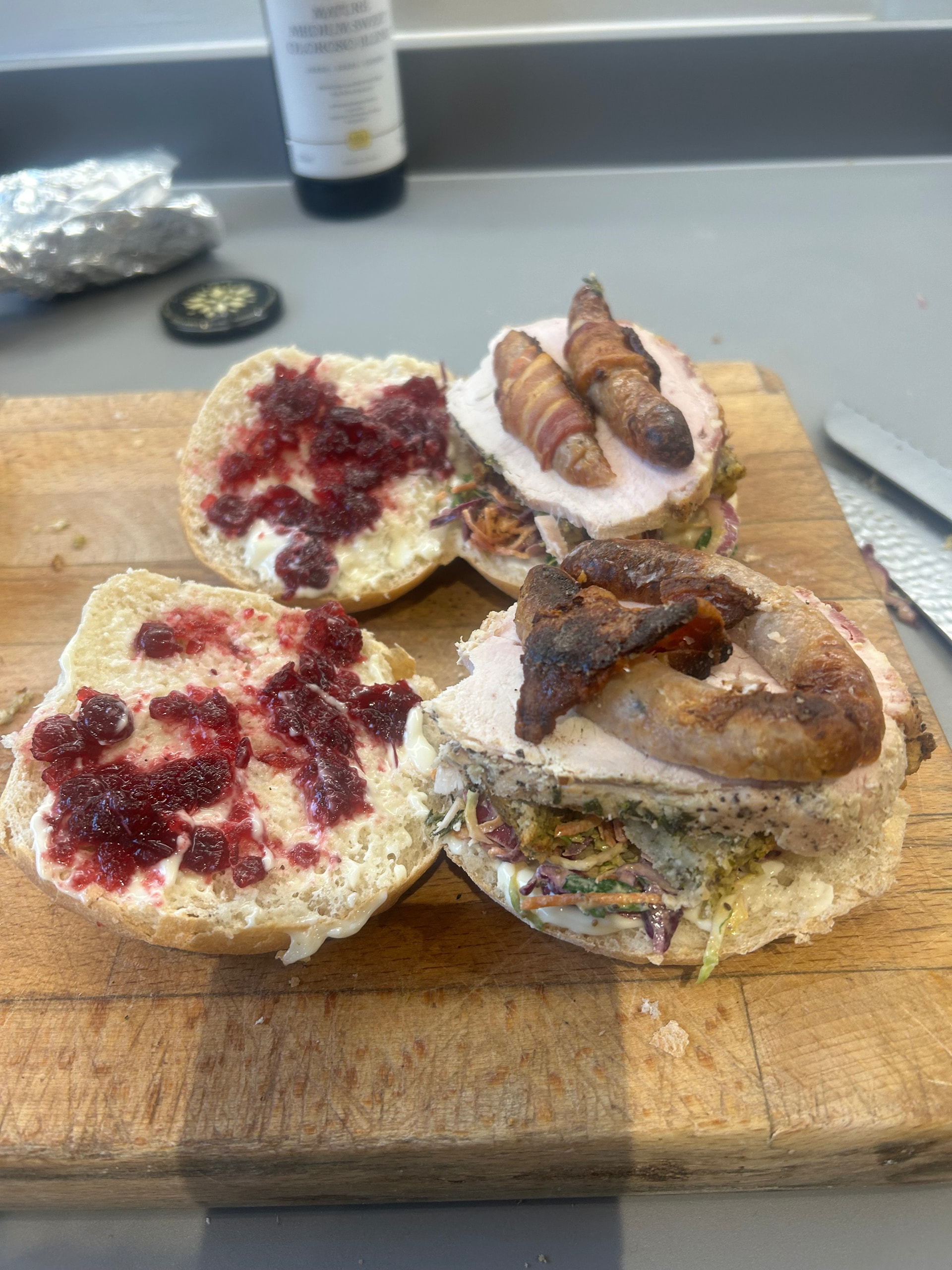 How’s that for a Xmas sandwich? Pigs-in-blankets and turkey on stuffing and brussel sprout slaw. Lubricated by mayo and cranberry sauce. Coming out on a long Boxing Day walk