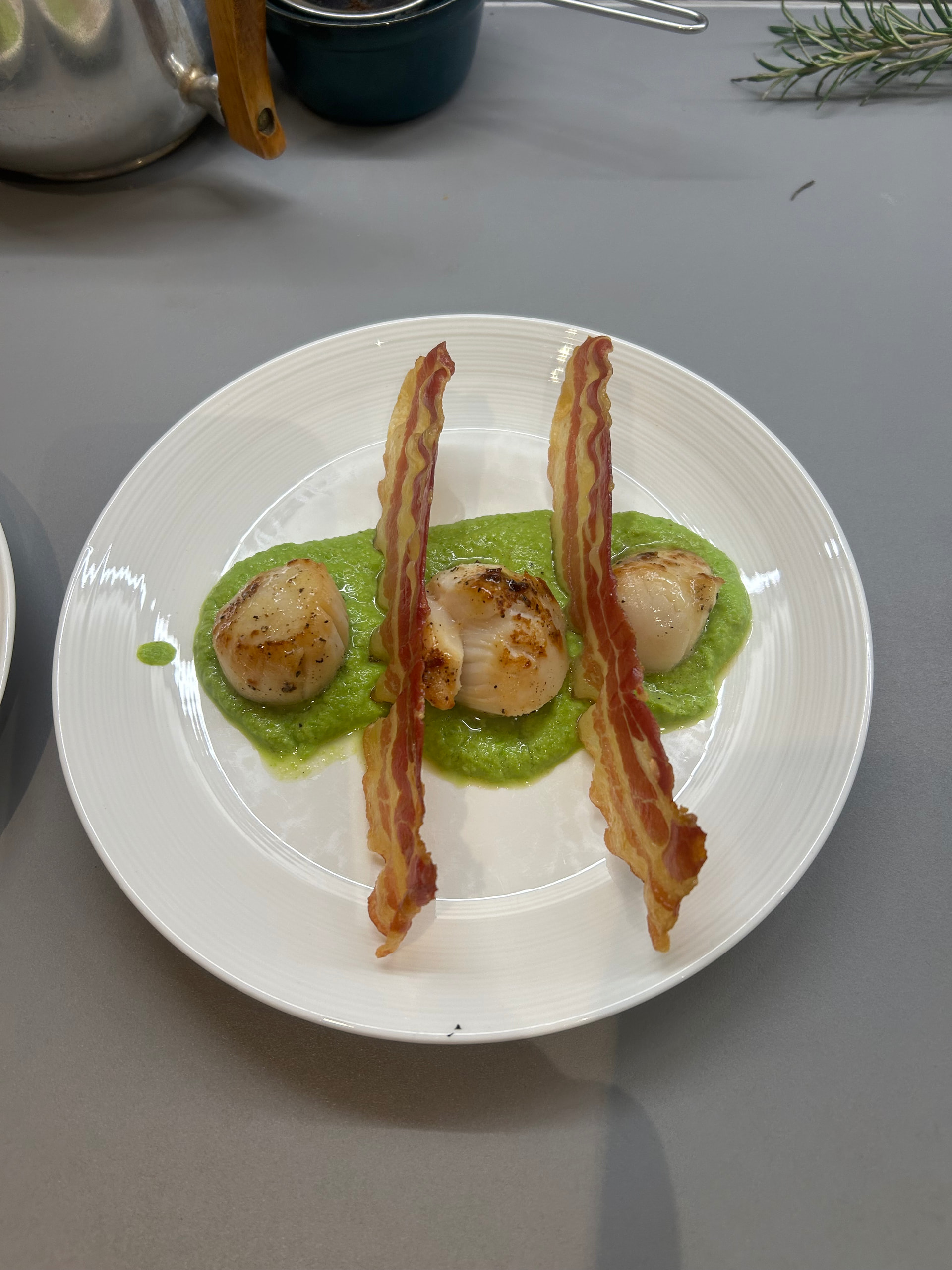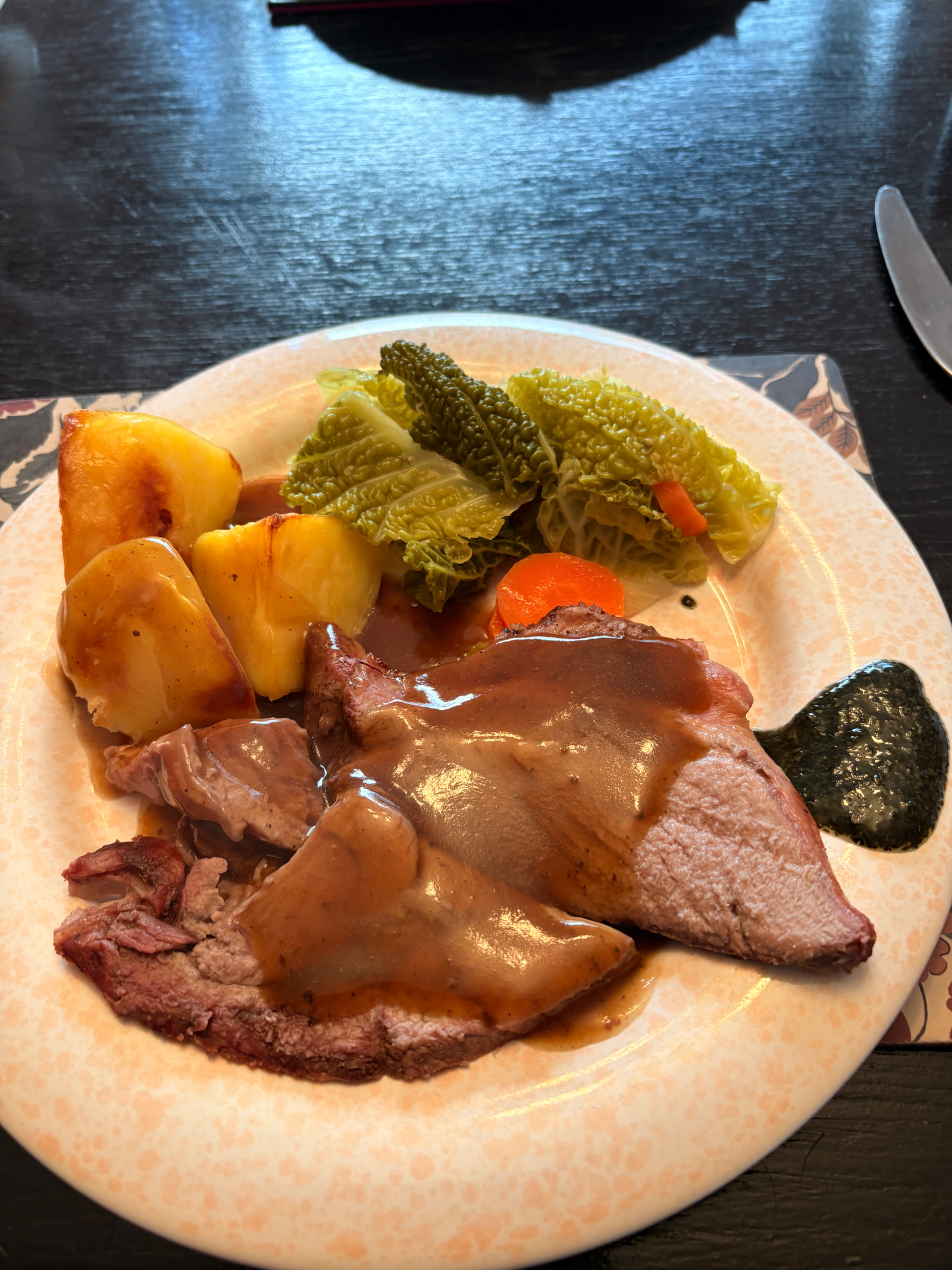 Pan fried pork chop with rosemary and sage, caramelised apples, roast spuds, braised cavolo and a cider, cream and mustard sauce