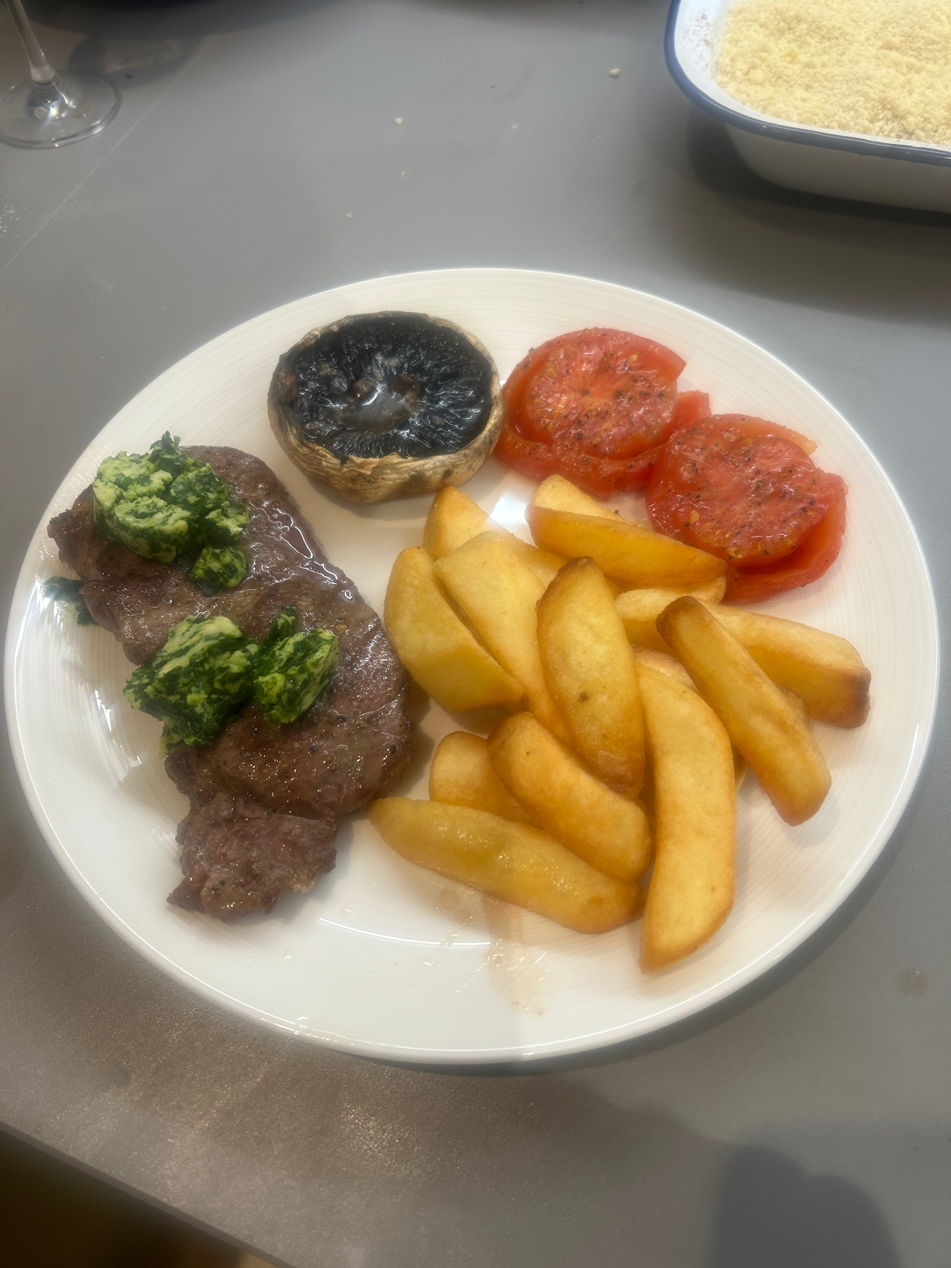 Pan fried sirloin steak with a new season wild garlic butter. Roasted mushrooms, toms and chips. We had an amazing Chateauneuf du Pape with this