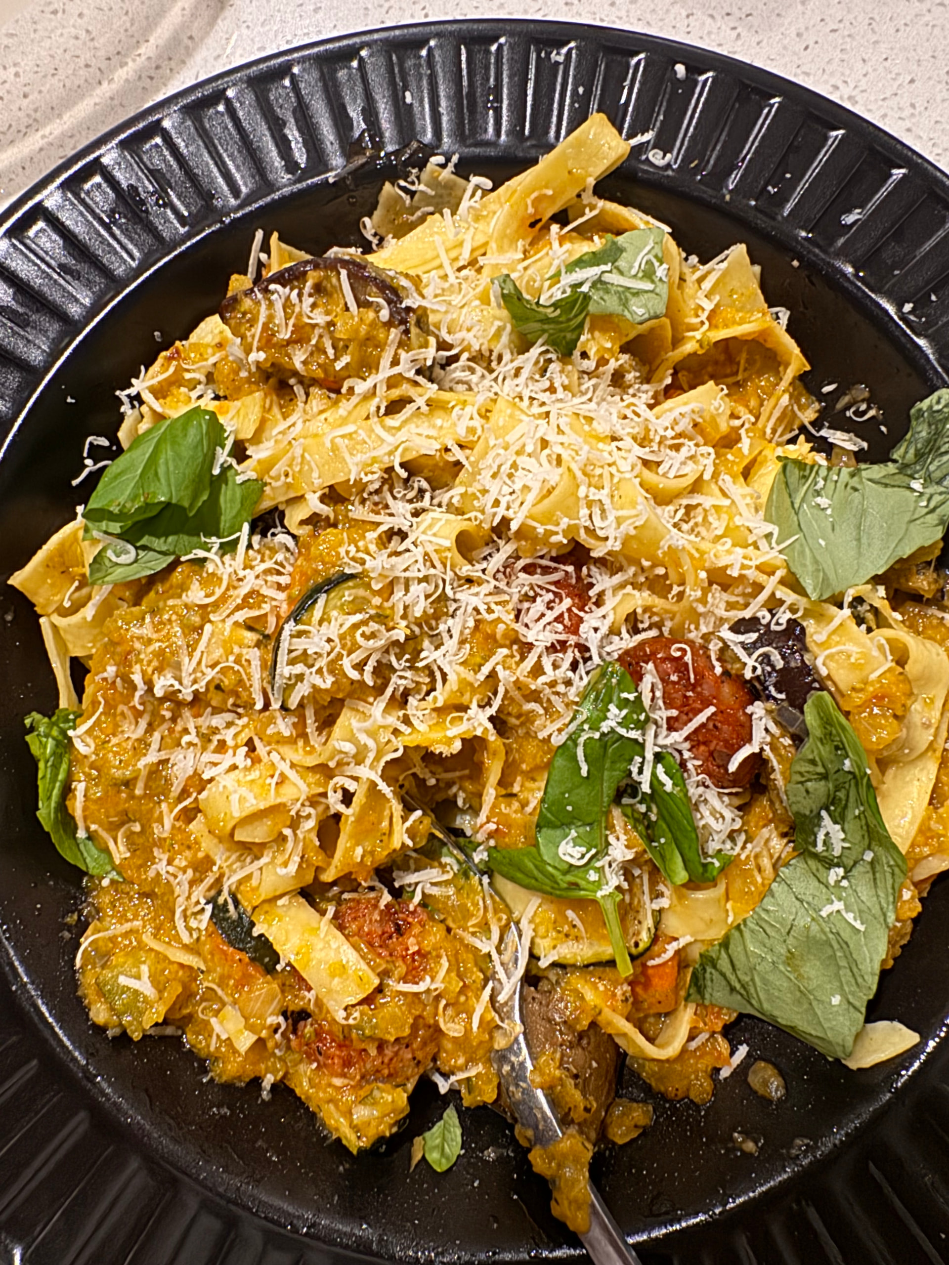 Unusually (for me at least) I blended in parboiled Broccoli into the sauce based on the missus’ suggestion. Added a creamy healthiness. Added roast homegrown eggplant and courgettes. Threw in a few bits of hot chorizo!