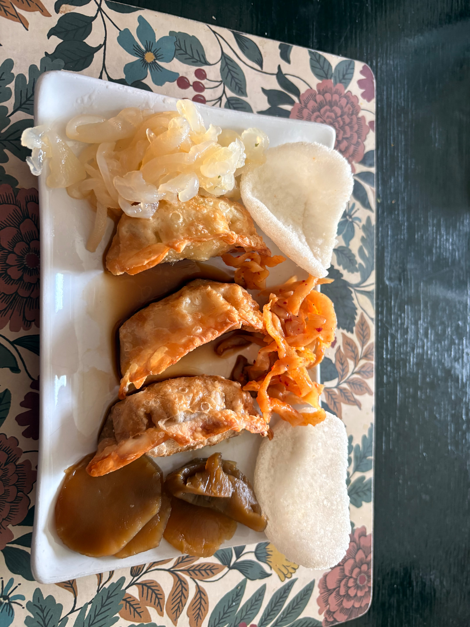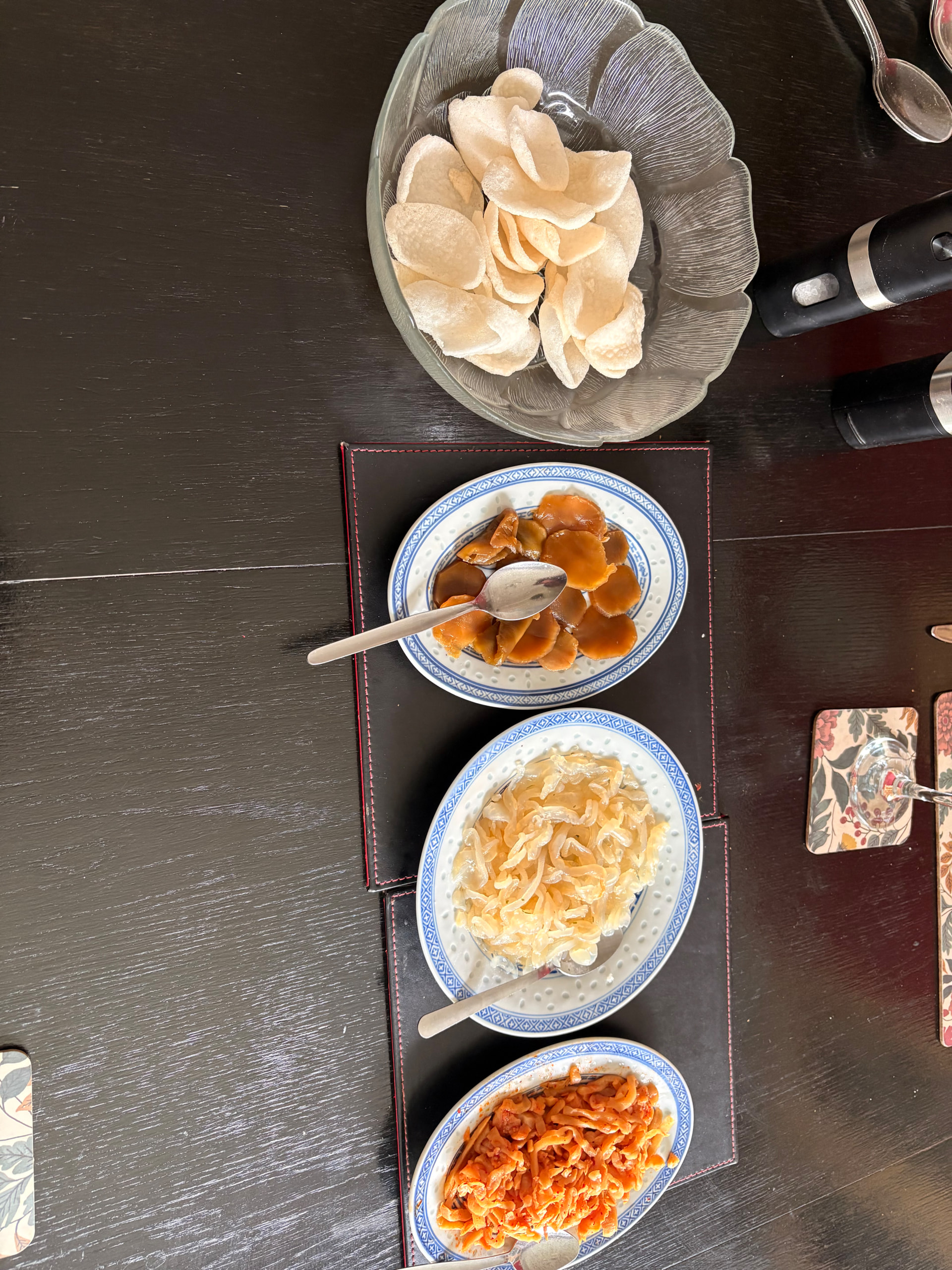 Sunday oriental lunch - prawn crackers, preserved lettuce, pickled turnip, spicy jellyfish. Sweet n sour pork, seaweed tofu in chilli sauce, stir fried vegetables and noodles. Lychees to finish