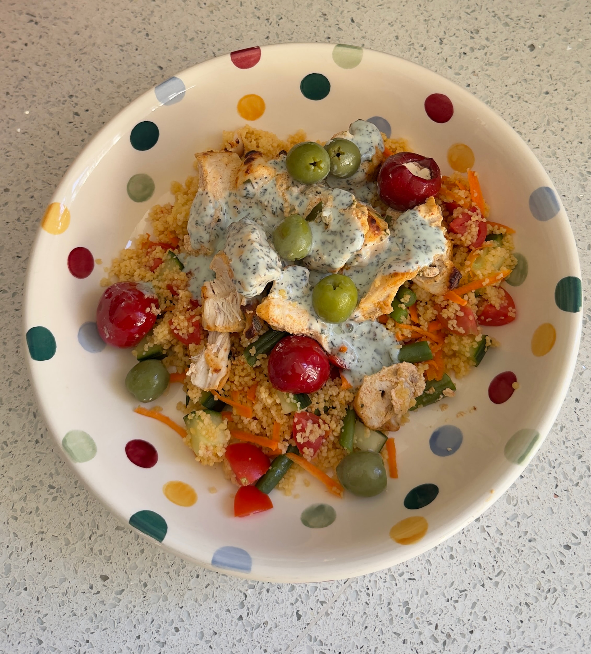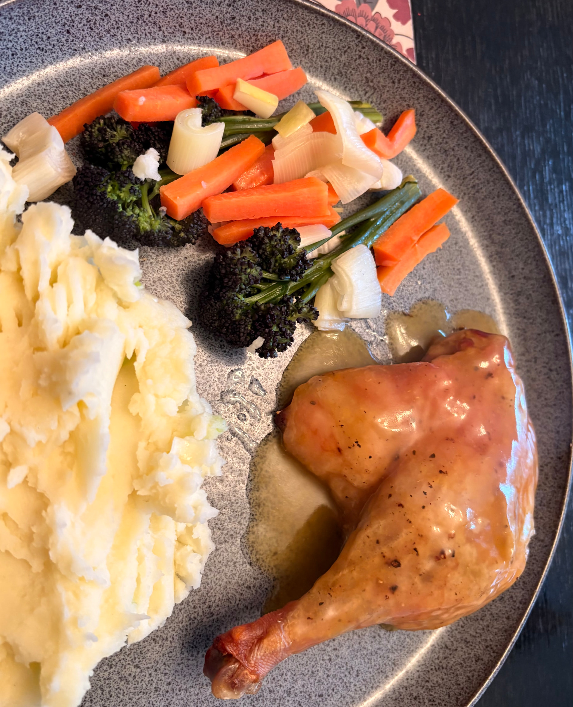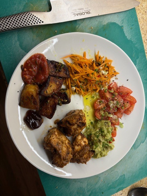 Indian spiced BBQ chicken, carrot salad, and leftover spiced roasties, with other bits. All good and fresh, for a warm day.