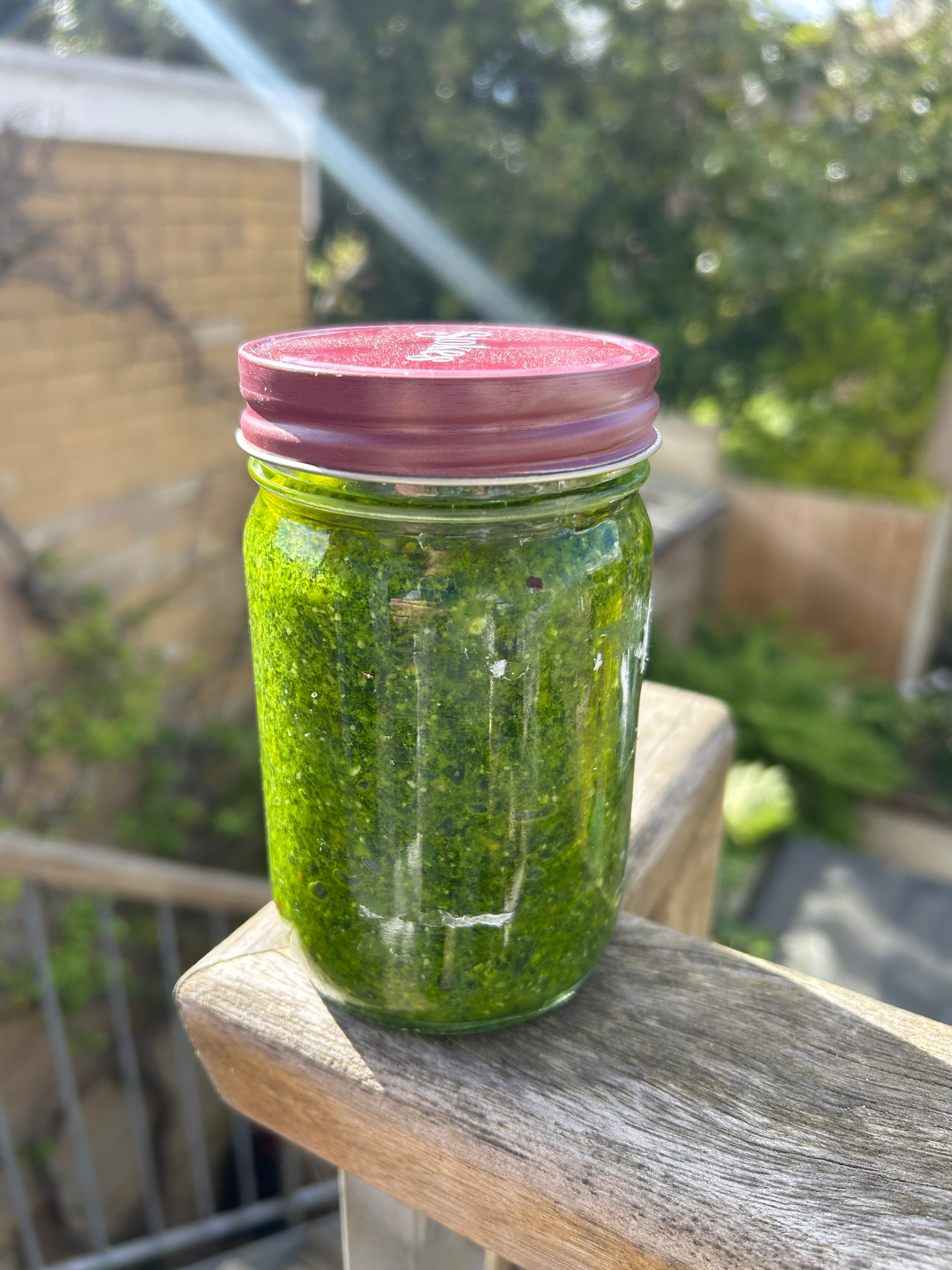 Whizz together in a food mixer and then add salt, pepper and a squeeze of lemon juice. Keeps for weeks in the fridge with a thin layer of oil on top to stop oxidation. It’s much milder than normal pesto so as well as using with pasta, it also goes very nicely with fish, chicken and lamb