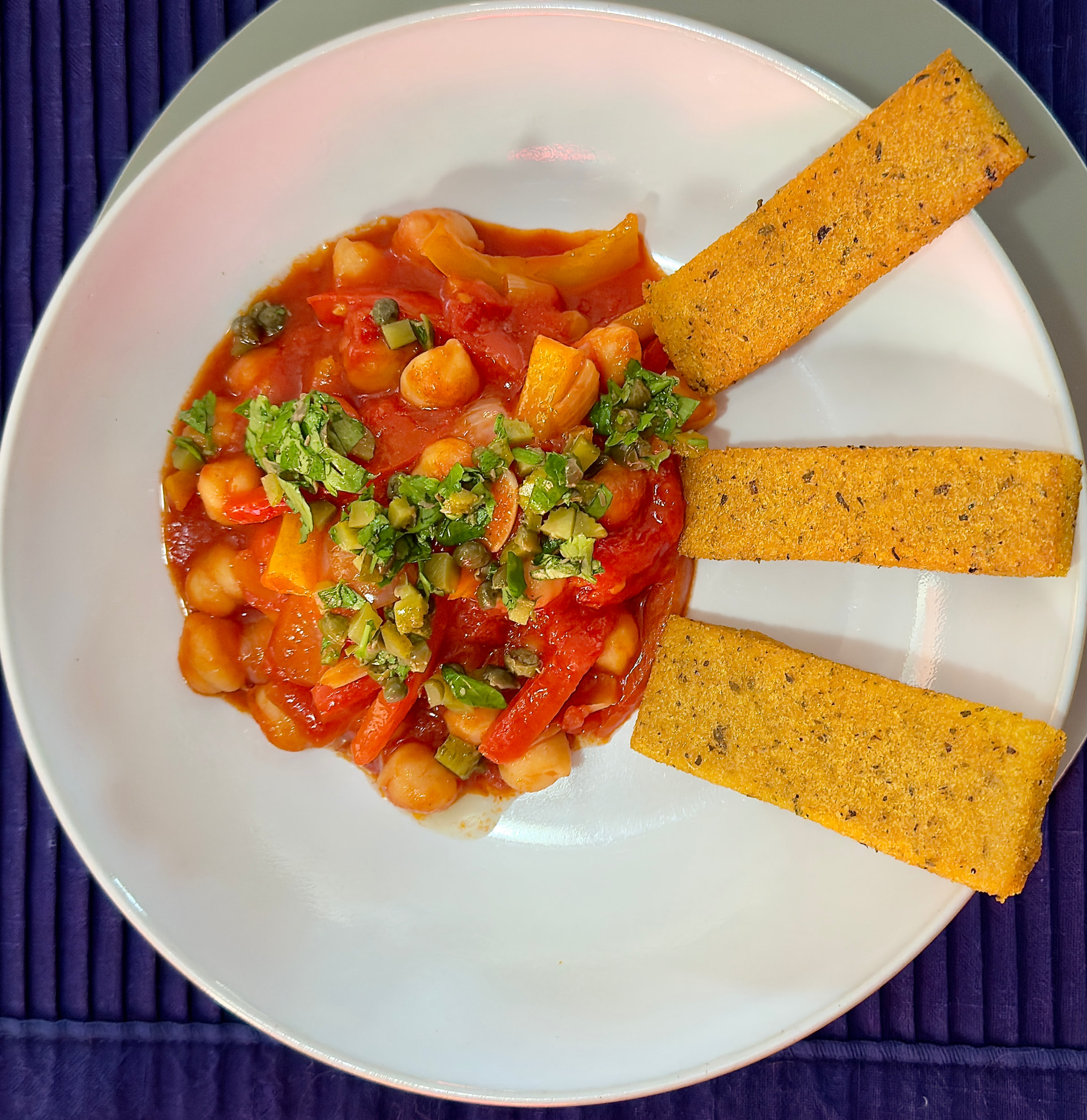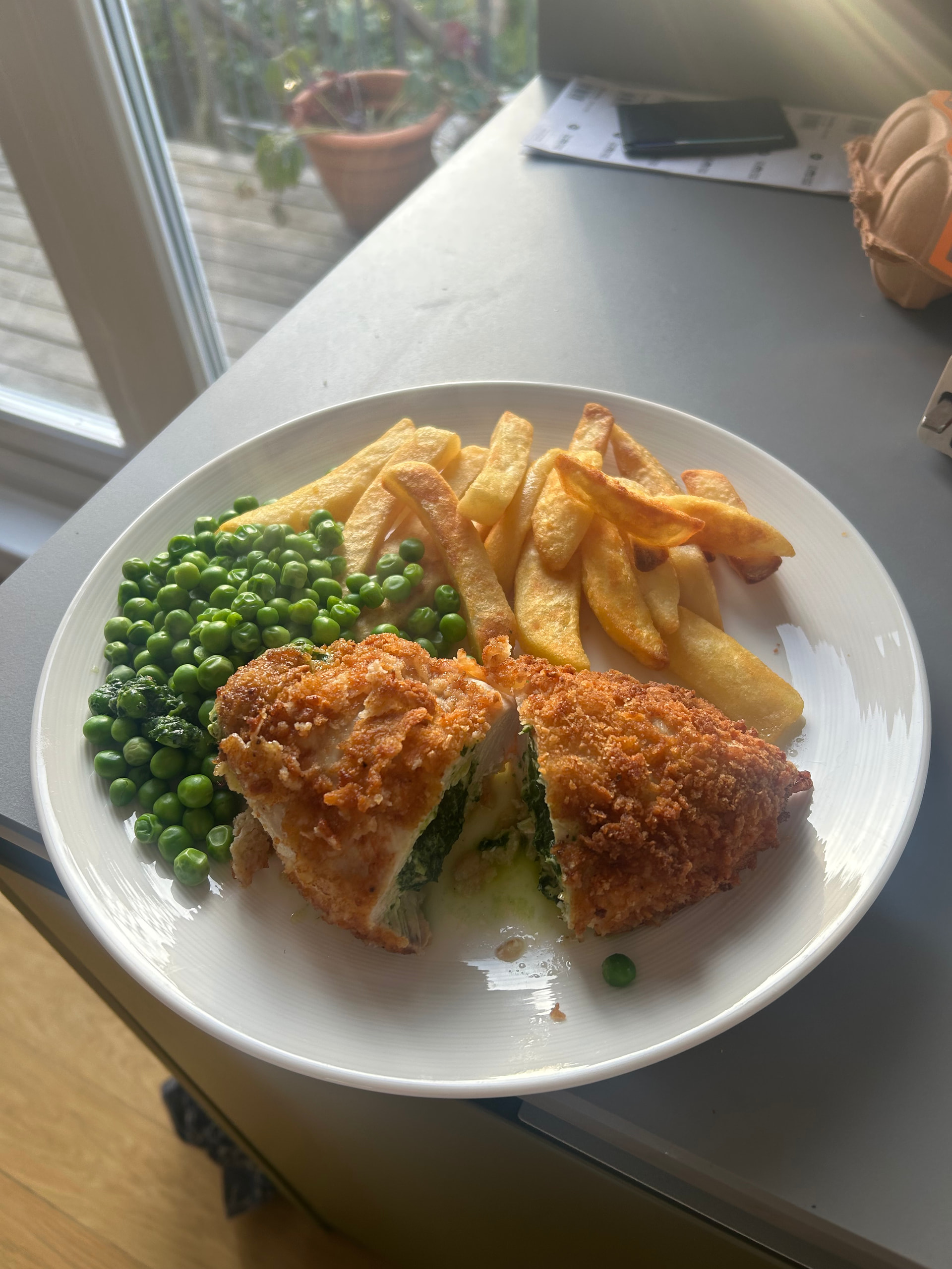 Chicken Kyiv made with wild garlic. I served it pub stylee with chips and peas. We had a Viognier with this and it was sublime