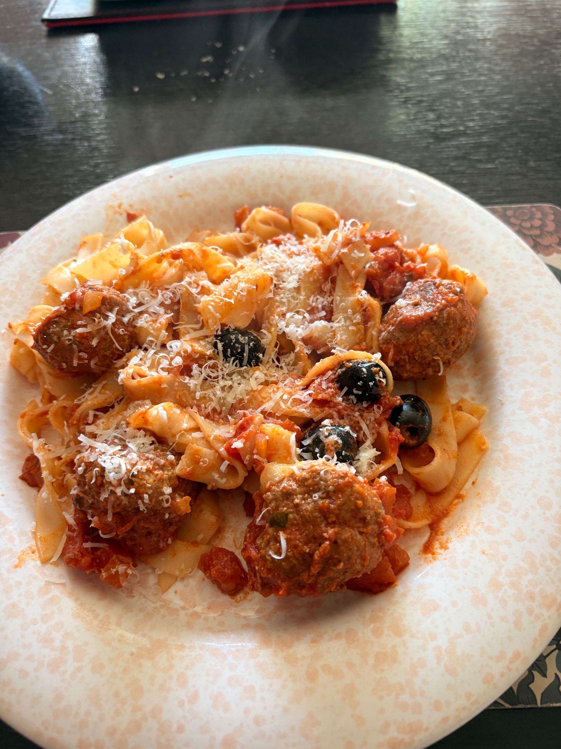 Beef meatballs in a spicy tomato sauce with tagliatelle