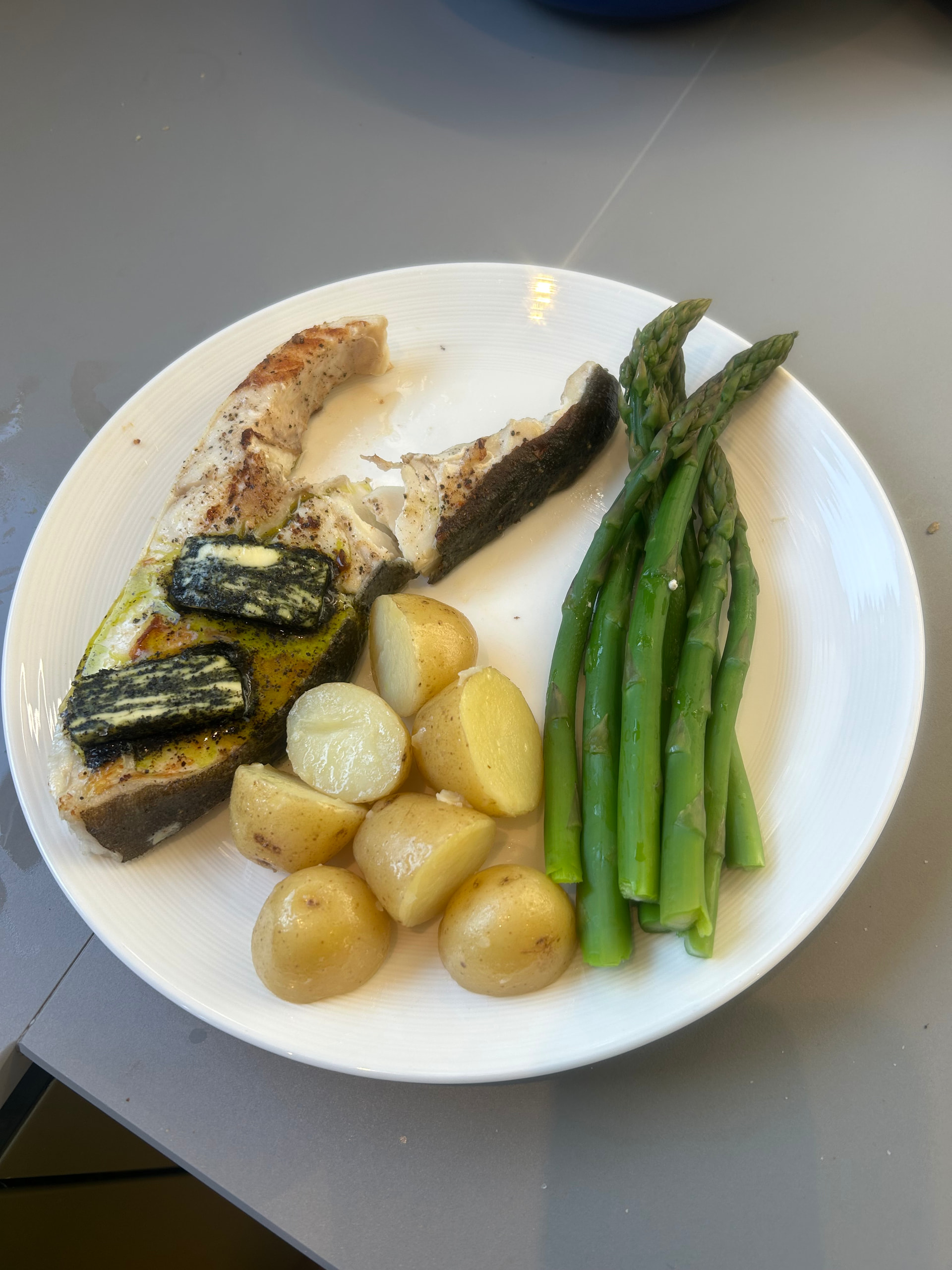 Pan fried wild halibut steak ( good enough for Jehovah) topped with a nori and smoked salt butter. Served with new potatoes and the first asparagus from our allotment