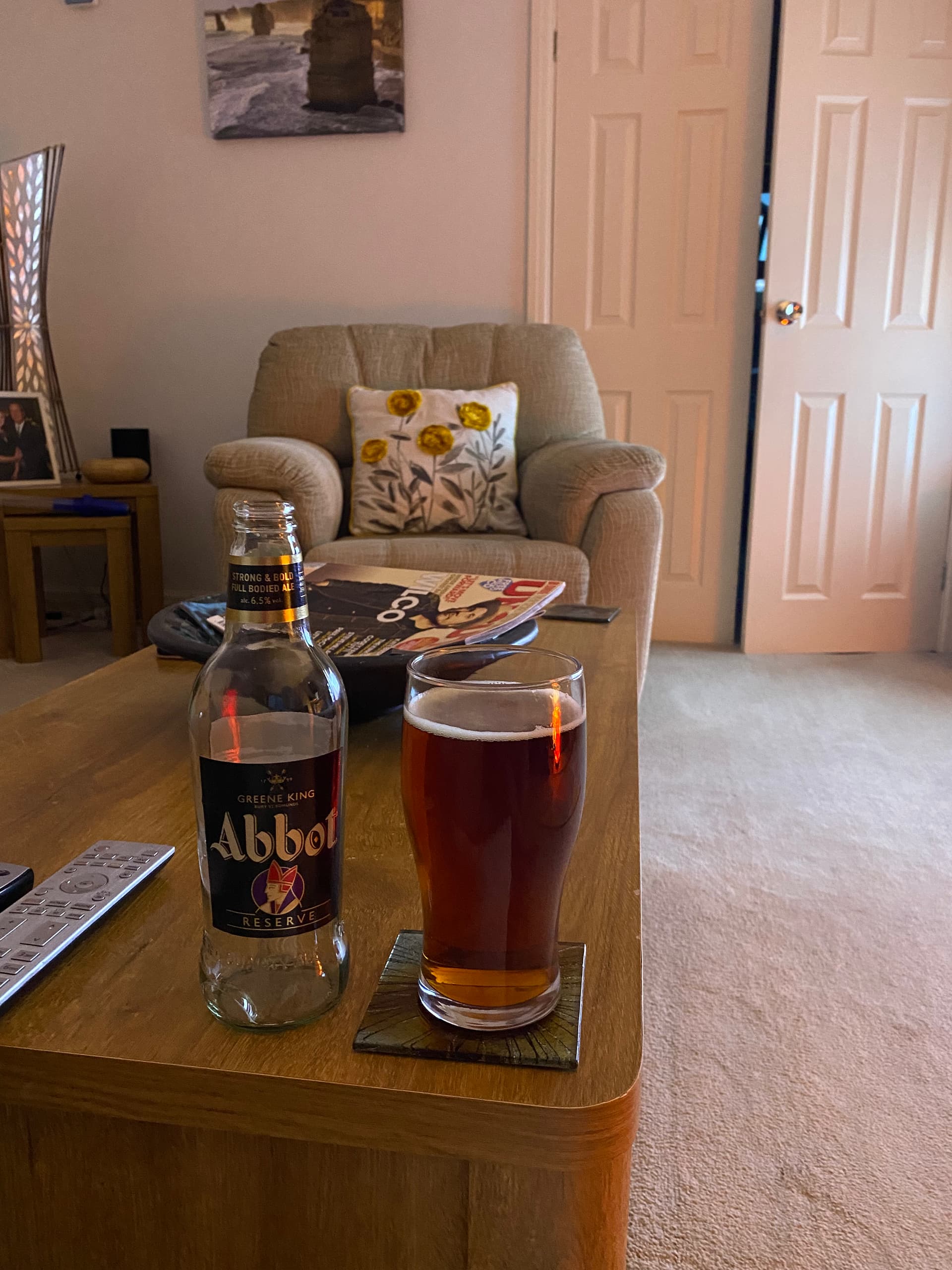 A reward for getting past the mid-point of my first week back at work. A pint of Winswept Wolf dark ale on a warm evening and managing to keep the sea view theme going!