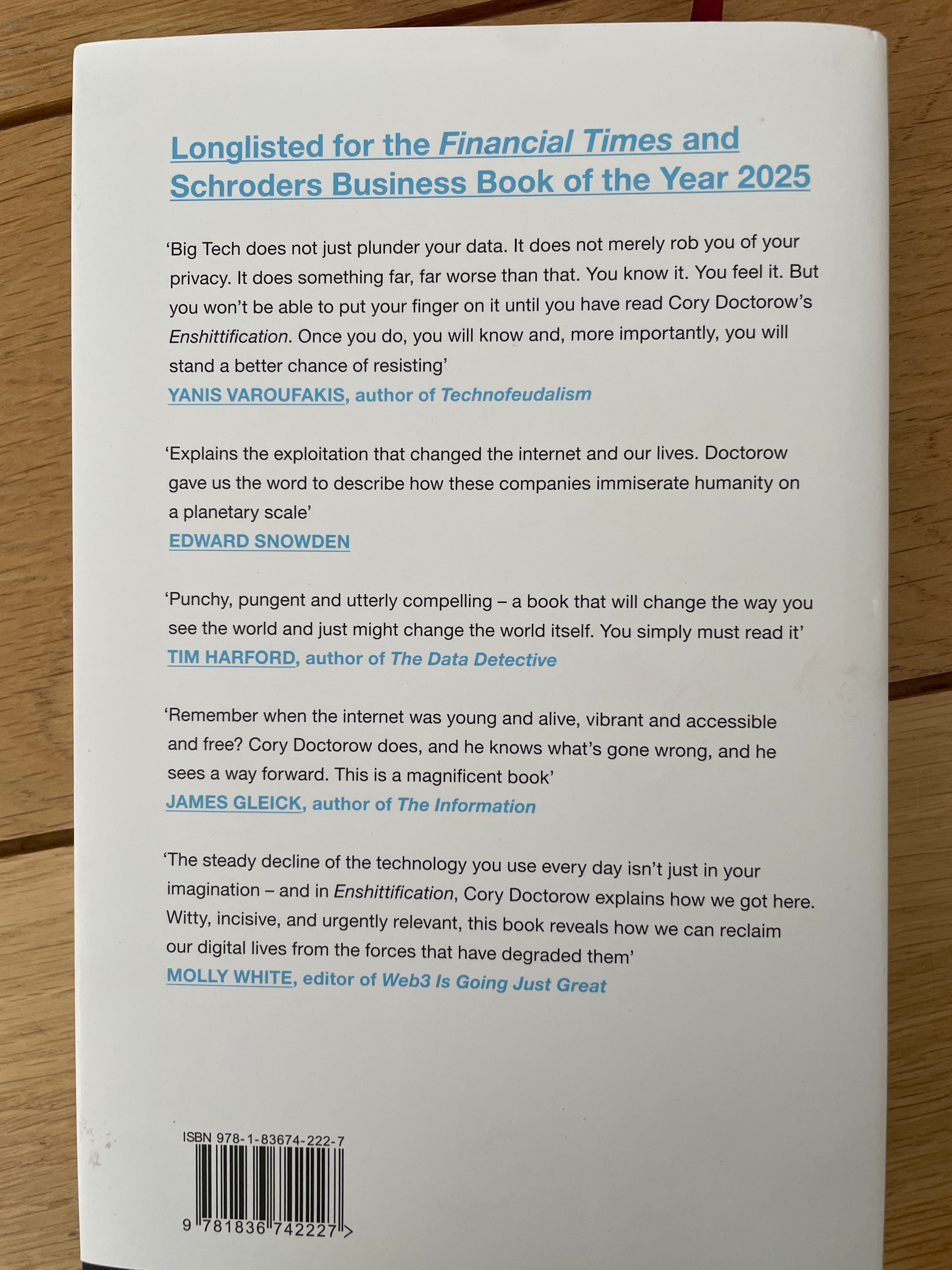 I’ve just begun Cory Doctorow’s ‘Enshittification’. I follow him on other platforms, so I’m familiar with the central thesis, but I’m particularly interested in the last section - how we mitigate/improve things.