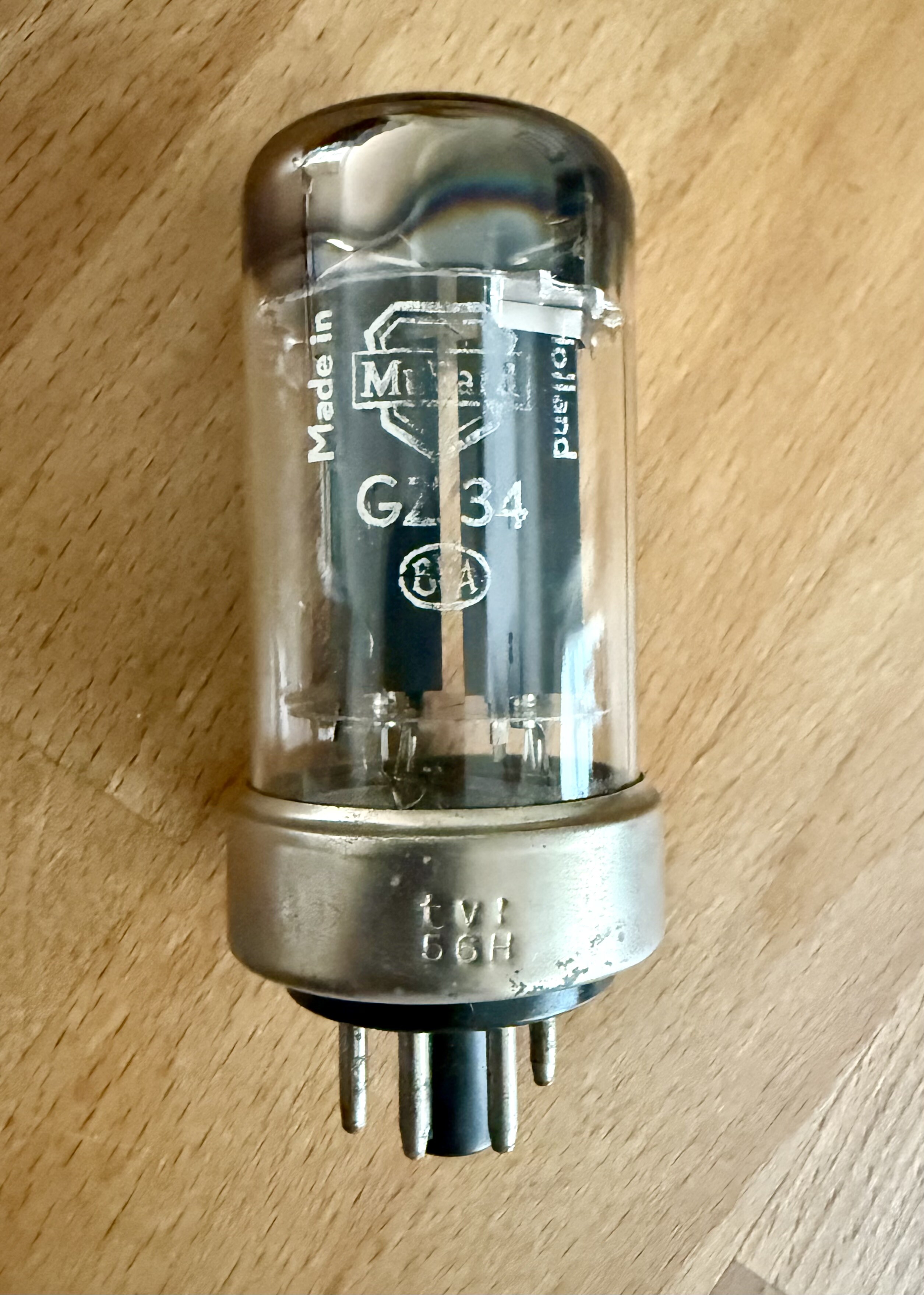 This is one of the holy grail rectifier tubes. The metal base GZ34. This one has the Mullard branding but was made in Holland by Philips rather than Mullards Blackburn factory. This one was NOS in its original box. These things have a massive lifespan… just as well!