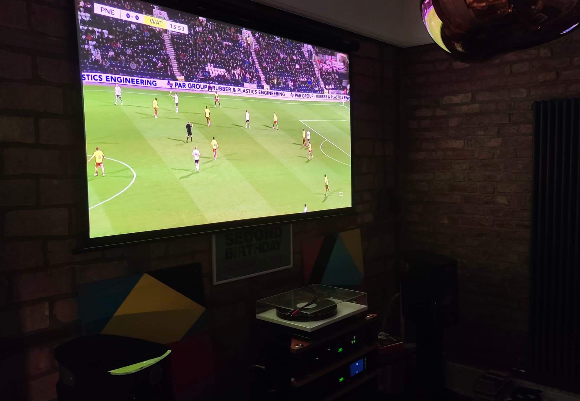 I finally got a projector screen installed above my system for the LG Cine beam projector I got a few weeks ago. My phone camera does not do the picture justice, but it’s fantastic. Especially with Watford playing on Sky Sports!!! Great sound through my system ![]()