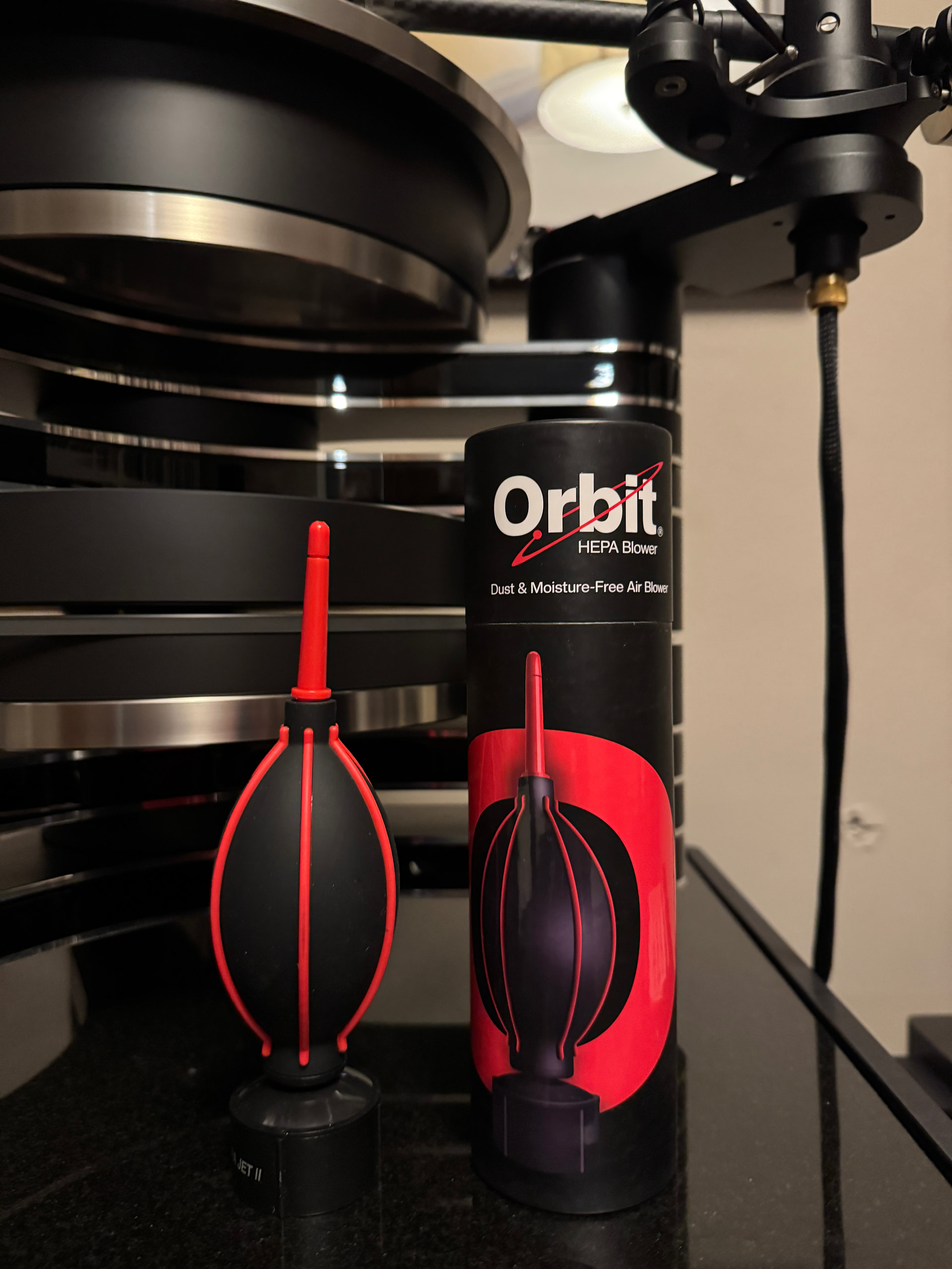 I have used one of those Giotto Rocket air blasters photographers use for lenses, but they can intake moisture and dust and blow it right on the record surface. On the recommendation of a chemist who wrote the book on aqueous cleaning of records I bought this one instead. It’s just like the Giotto but has a HEPA filter to eliminate moisture and dust on air intake.
