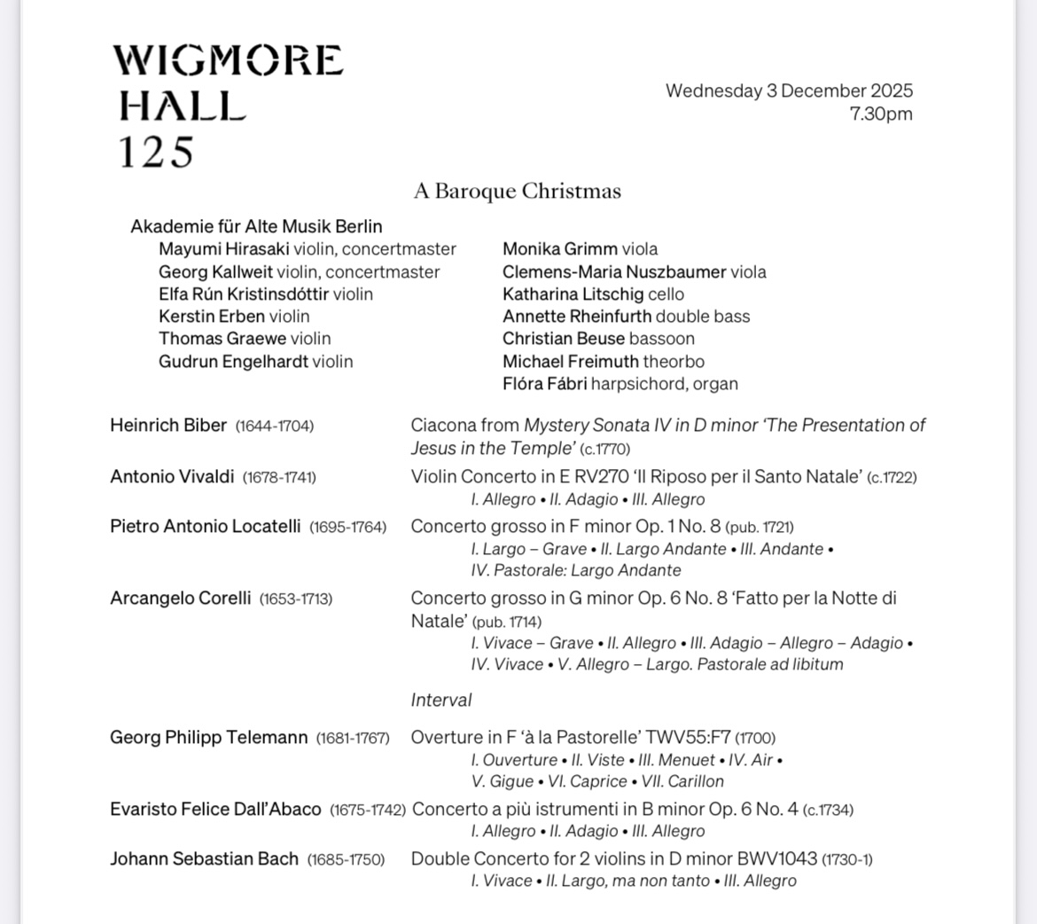 The Akademie fur Alte Musik Berlin at the Wigmore Hall in London this evening playing a ‘Baroque Christmas’ concert. Absolutely first class playing from an extraordinary ensemble at the top of their game