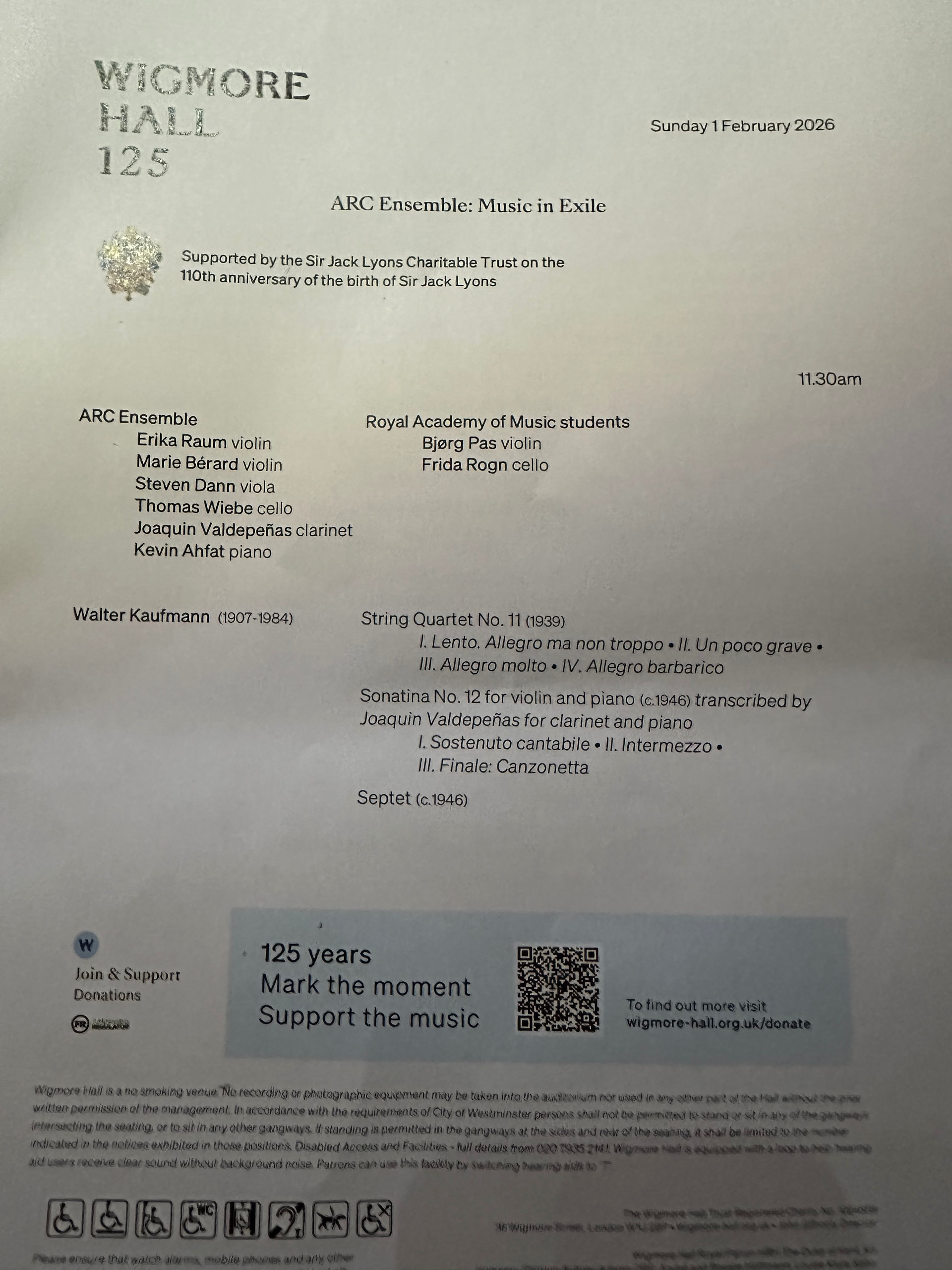 A weekend on my own so I took a chance yesterday on a composer I knew nothing about at the wigmore hall in London. Enjoyed the music very much, although clarinet and piano didn’t get me too excited. A bit bland. The string quartet and septet were really well played and I may explore the music of Kaufmann a little more.