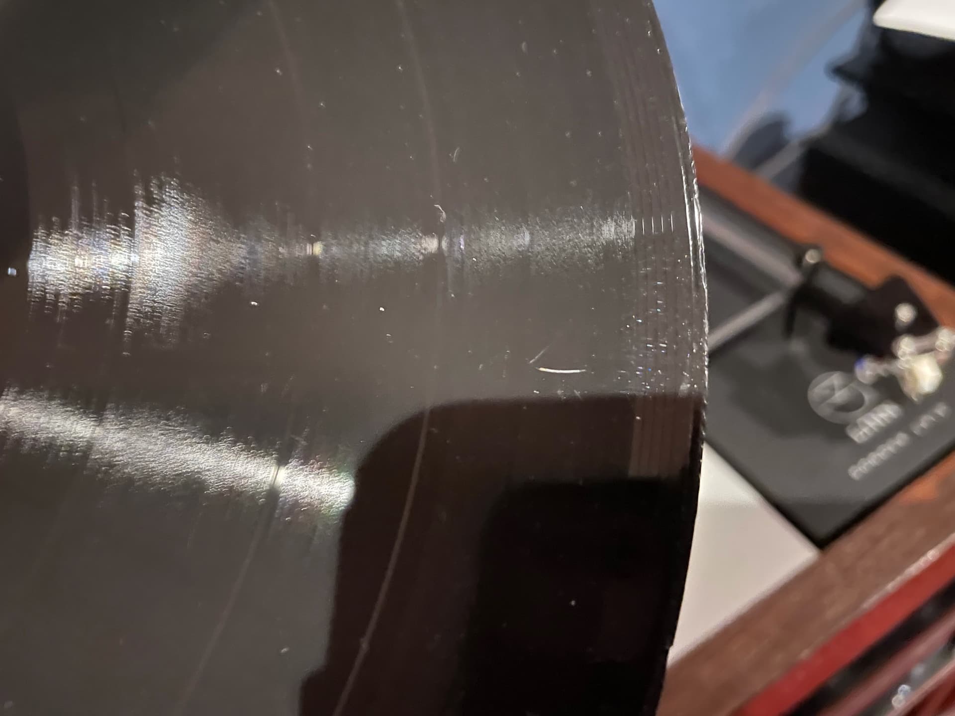 Oh dear, that is very disappointing. Here’s the photo of the scratch which I sent to Jessica. The scratch looks white in the image, just above the shadow of my iPad. Is this the one? I also have a video of the eccentricity, but that’s too difficult to post here.