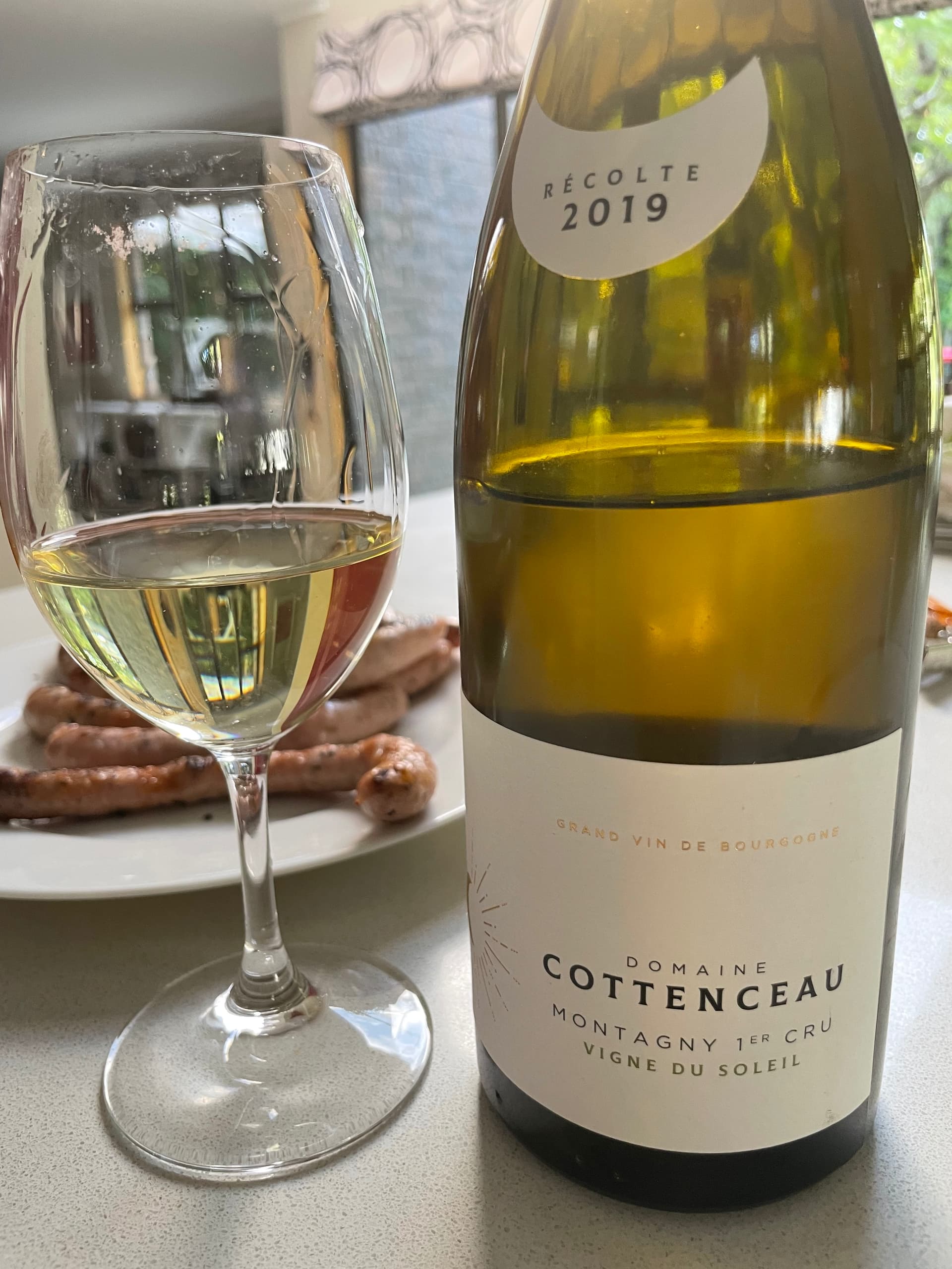 We had some pork and fennel sausages on the bbq tonight. We slapped them on some whole meal bread with mayonnaise and sauerkraut. Went very well with this Montagny premier cru Chardonnay from southern burgundy .