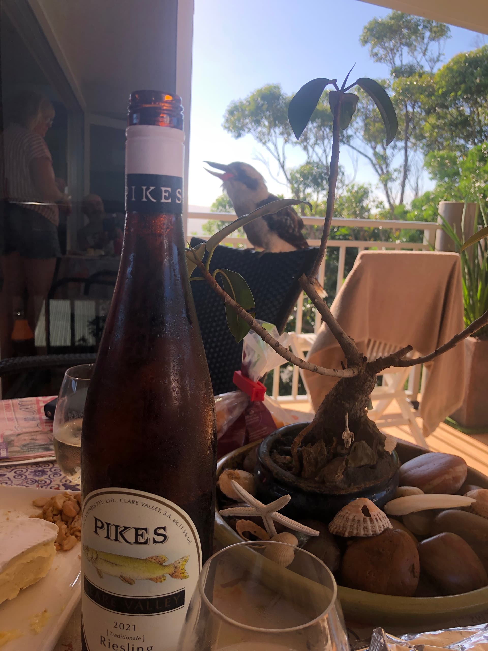 Couldn’t get any more Australian, a wonderful Clare Valley Pikes Riesling, some great King Island cheese and one of our friendly kookaburra on a beautiful warm Sunday afternoon (watching cricket too).
