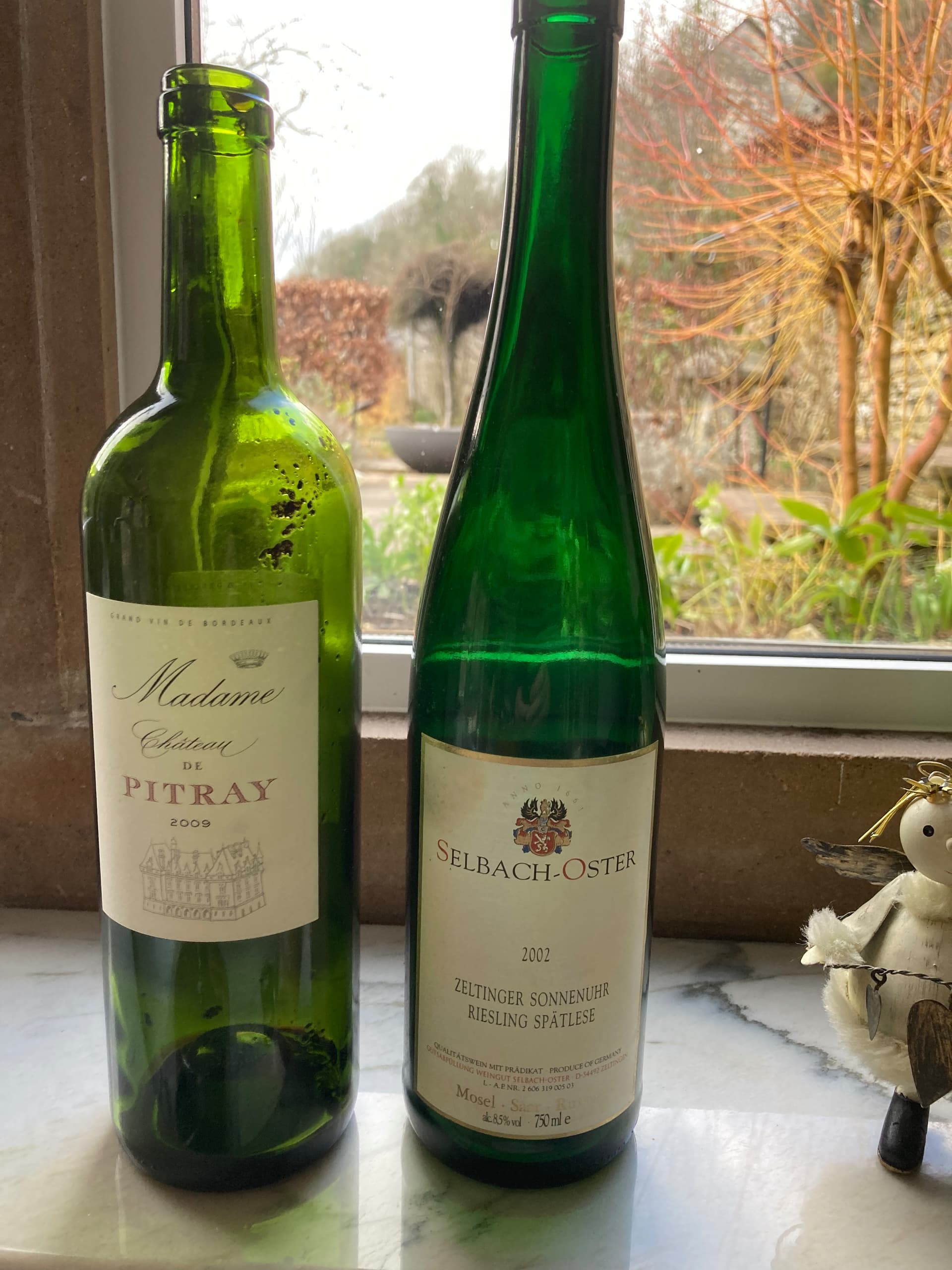 Lunch with friends; the Riesling accompanied sockeye salmon, and the claret some cheese.