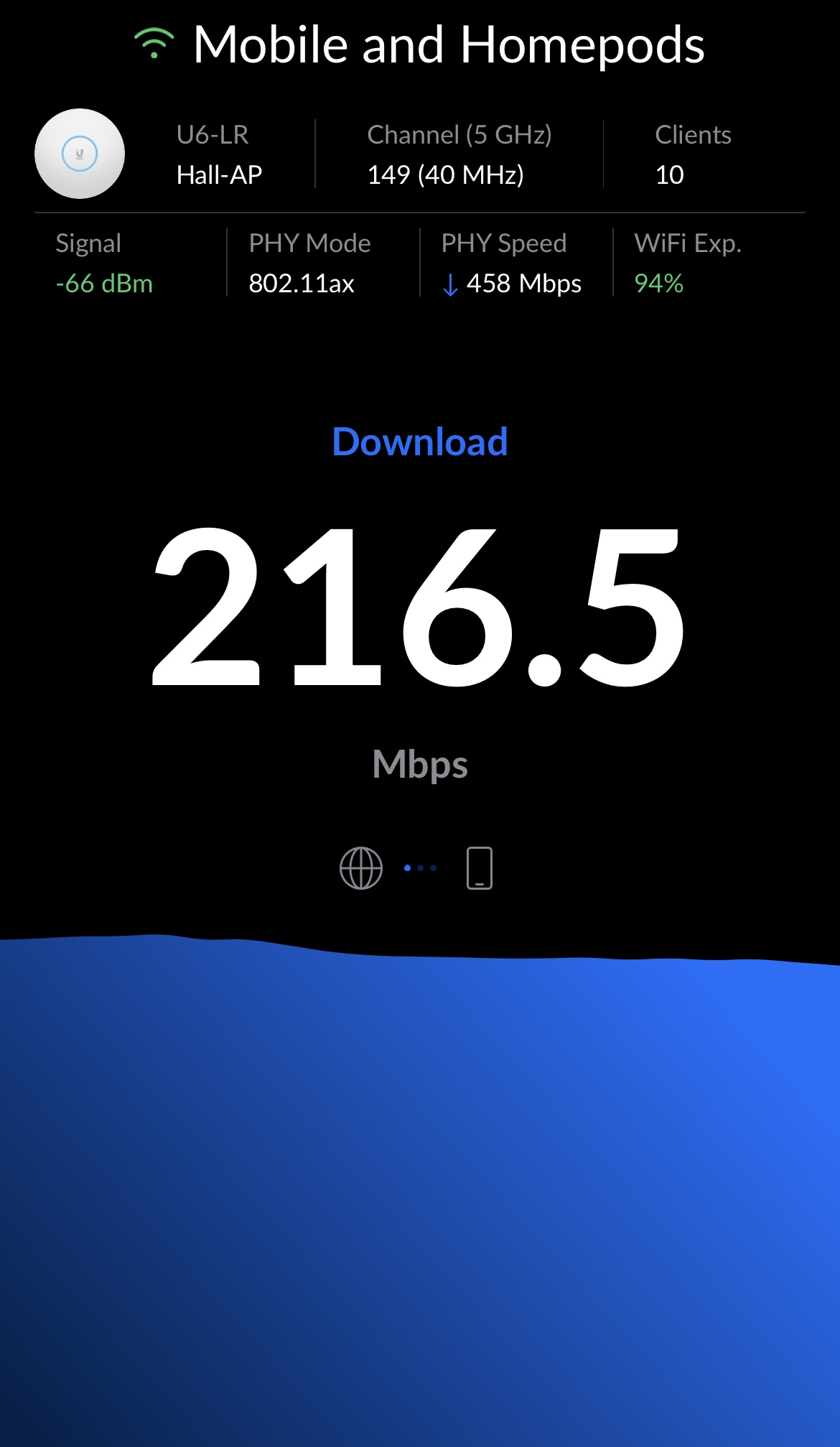 I tend to scan WiFi networks to see what the neighbours are using and from there, decide which 3 non overlapping channels I use, one for each access point. This helps keep interference down and WiFi speeds up. The AP below has 10 clients but the WiFi network tested only has 3 of them. It was setup for 5ghz only clients (Atom HE being one).