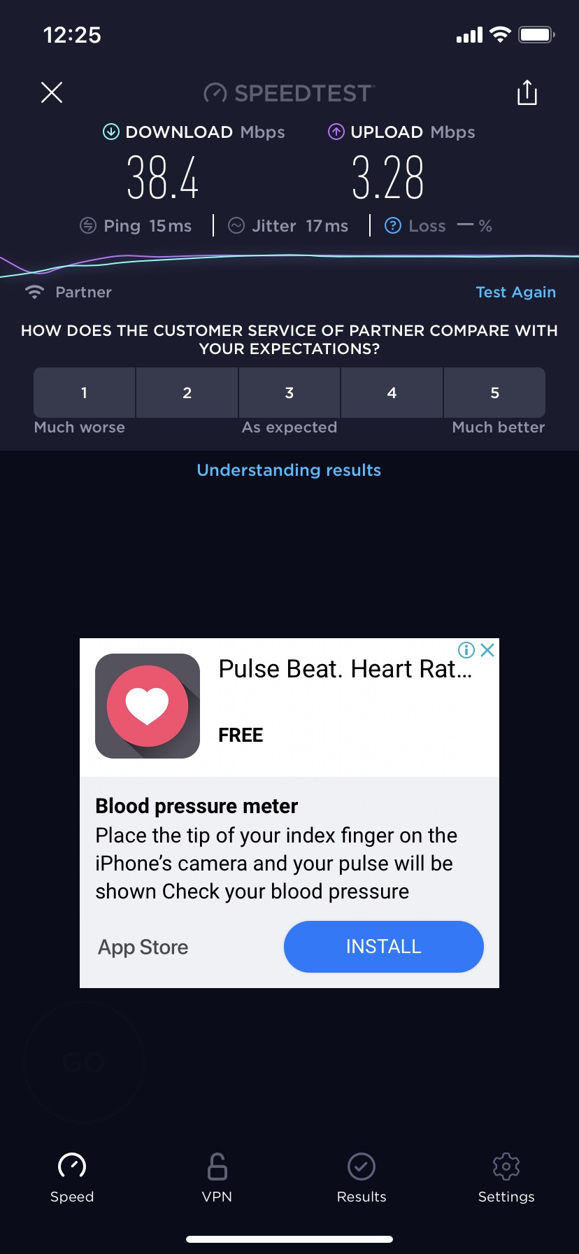 This time in the evening I always get the slowest speed. I use a wireless internet connection plus wifi internally. Right now I have 60Mbps download and 20mS ping.