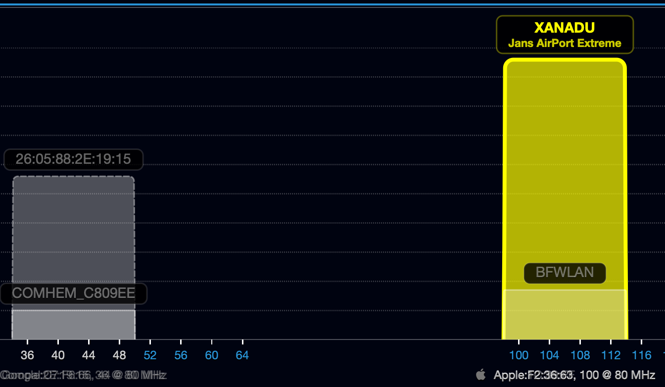 Below “Xanadu” is my wifi-network and there is another (BFWLAN) on the same channel, but is such a low level I dont care. If you use 2MHz Wifi it can be much more crowded. I think most routers do this channel-optimization for you, but it may cause problems if it is to crowded.