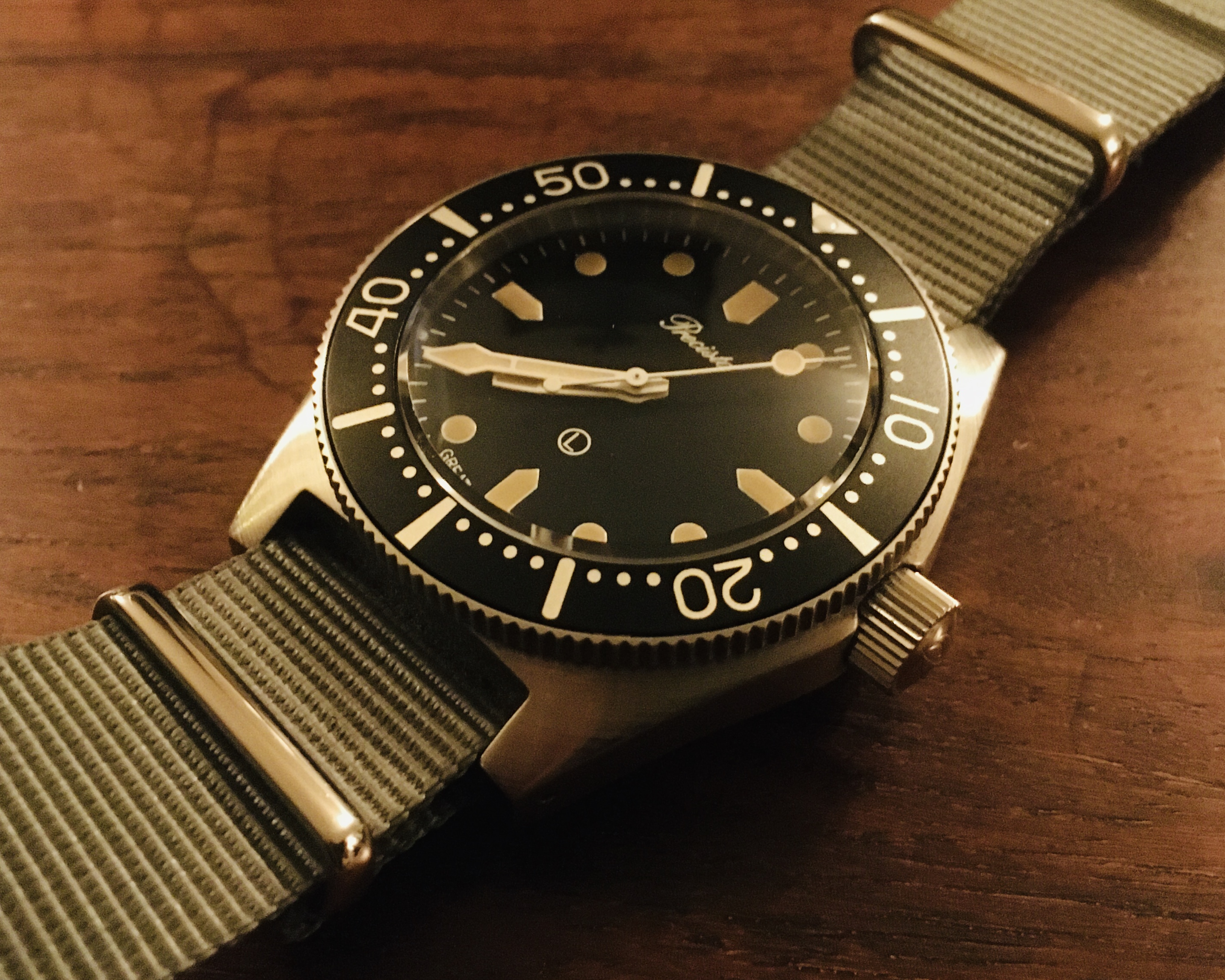 Iāve had this watch for a few years now and since finding just the right strap for it (a CWC vintage grey NATO) Iām wearing it quite a bit. Itās the Precista PRS-82 Royal Navy Diver, a reissue of one of the rarest RN diving watches, and the last one issued before the quartz era.