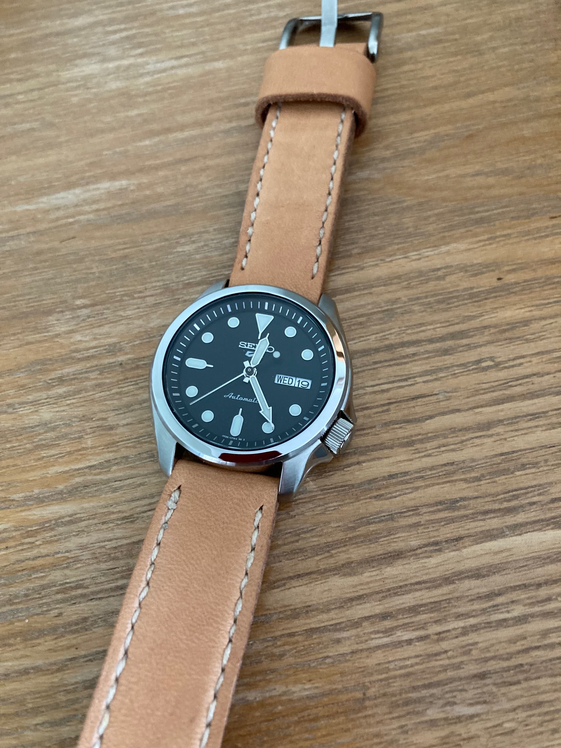 Up date on the seiko srpe55. New strap courtesy of Rich at Toshi straps. Horween Essex leather, I was unsure about it after ordering but I think it sets off the black face nicely