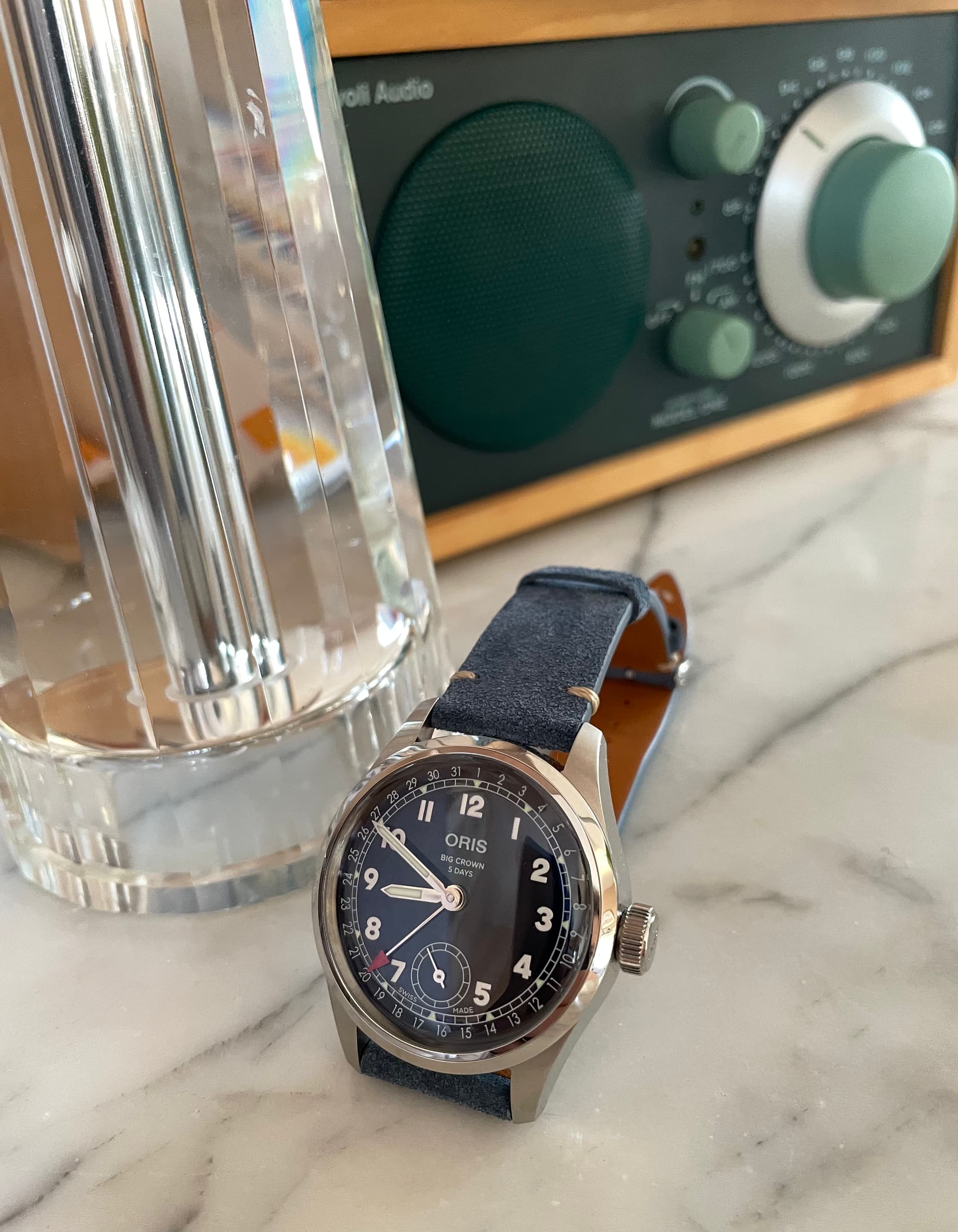 I’ve just put a new strap on my Oris. The black one was a bit formal, so as the face is a very dark blue I thought I’d go for a blue suede strap. I rather like it.