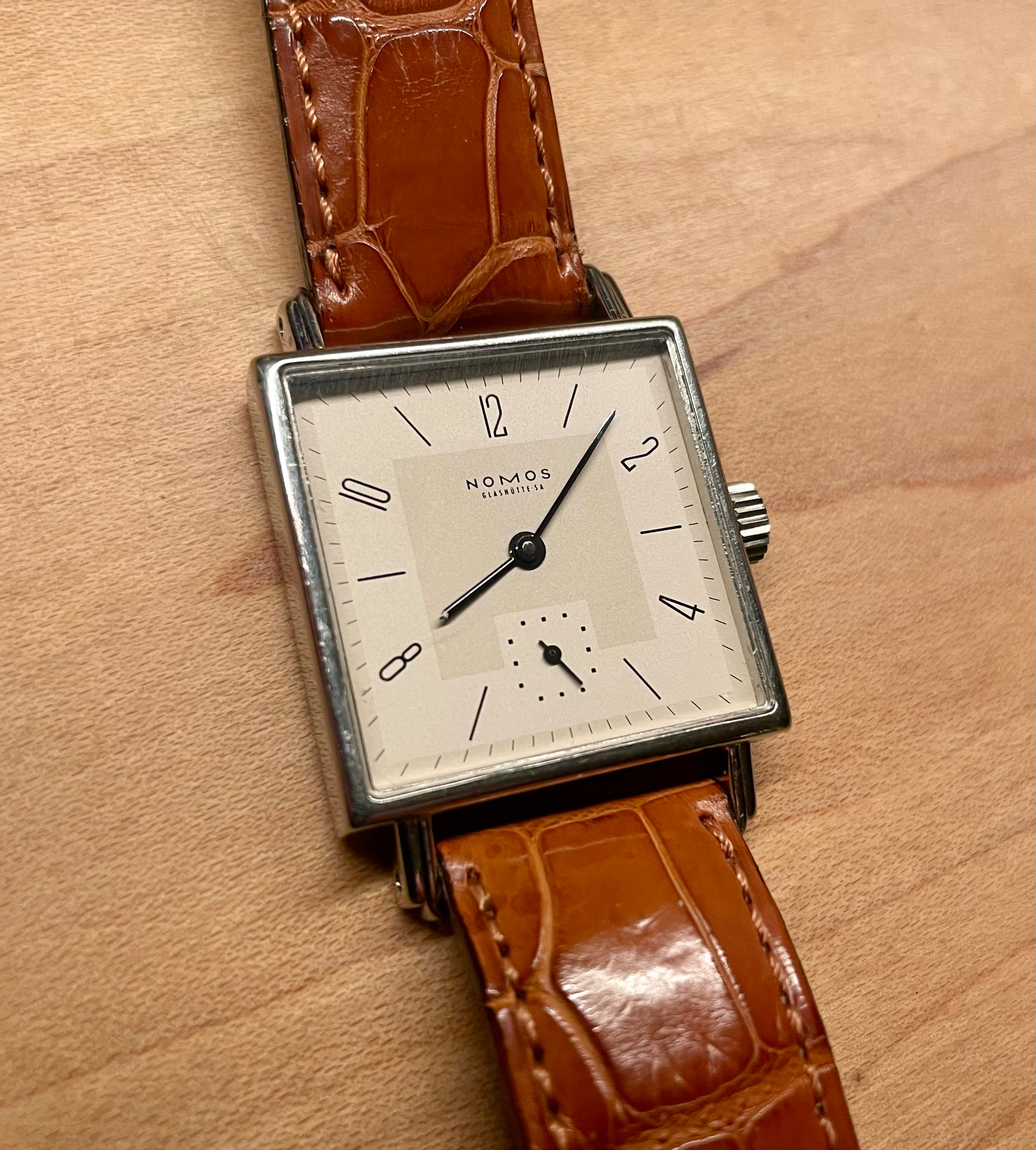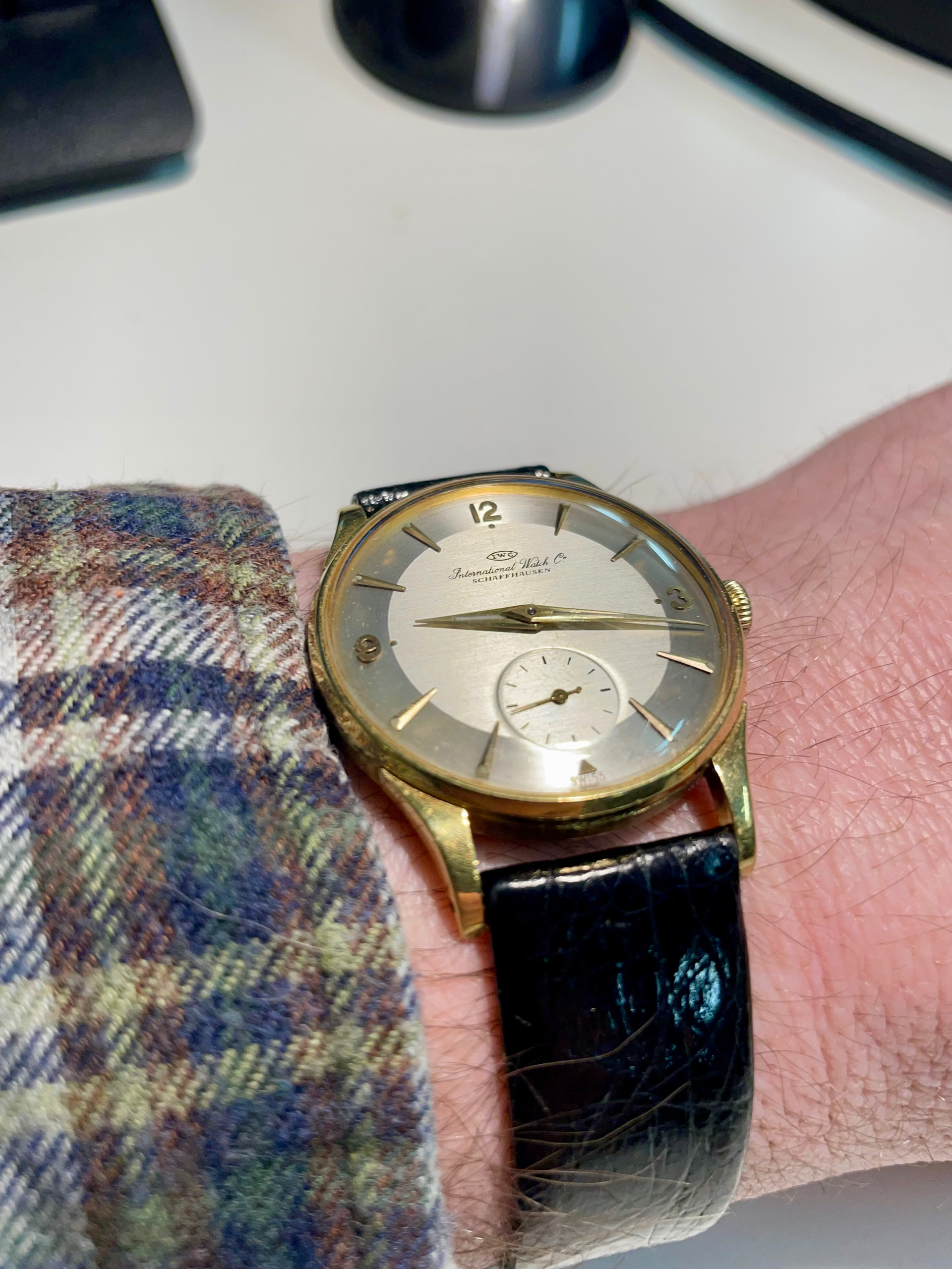 My late grandfathers 14k cal 88 Sunday watch. After he passed in 1970, it was in a drawer until 2010 where I got it. The dial got sent to Switzerland for a service. It sits on a Kuki Flex croco strap with an IWC buckle.