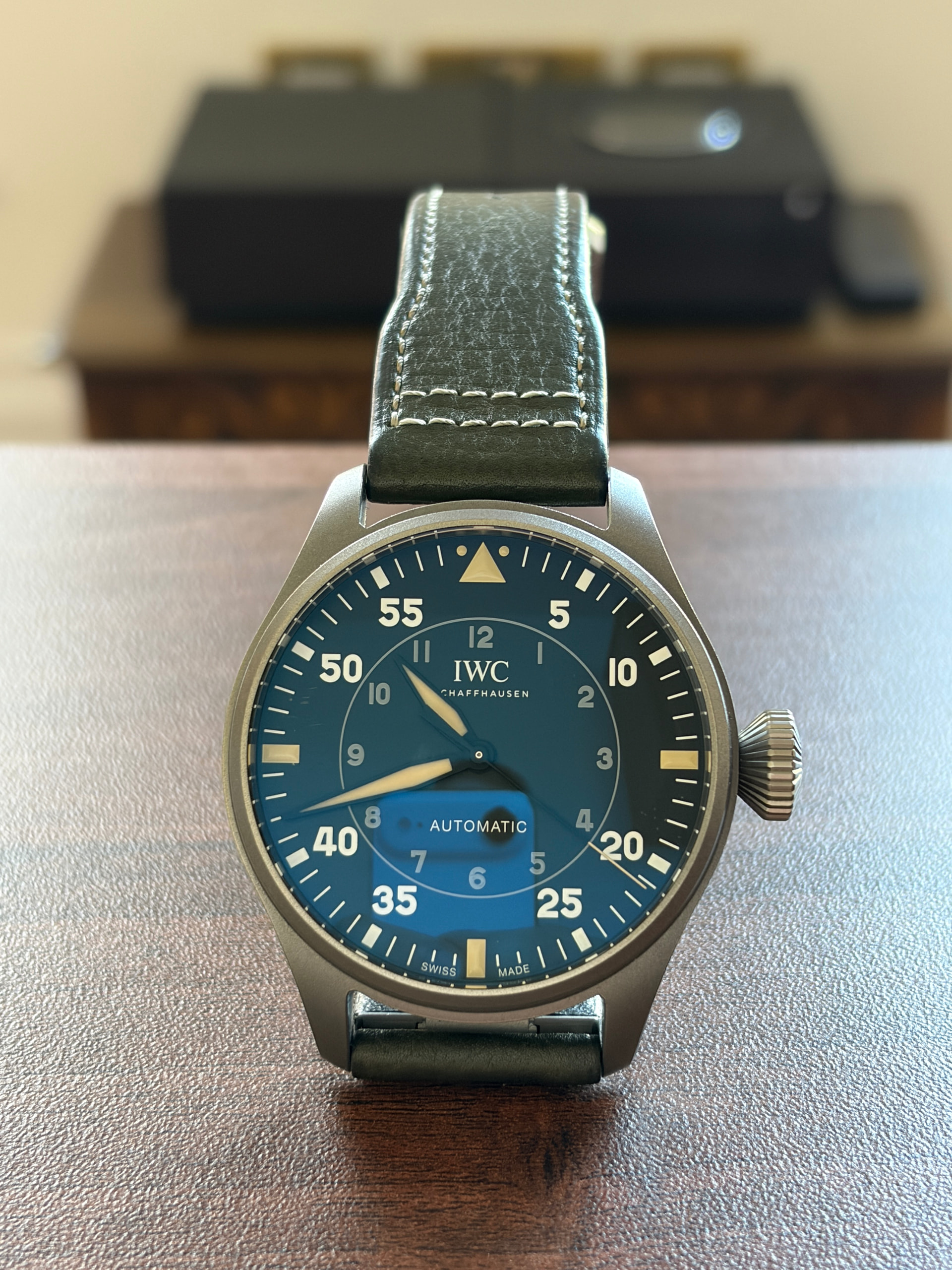 My IWC Big Pilotās Watch 43 Spitfire with a green buffalo strap; both are so hard-wearing that it makes for ideal daily wear.